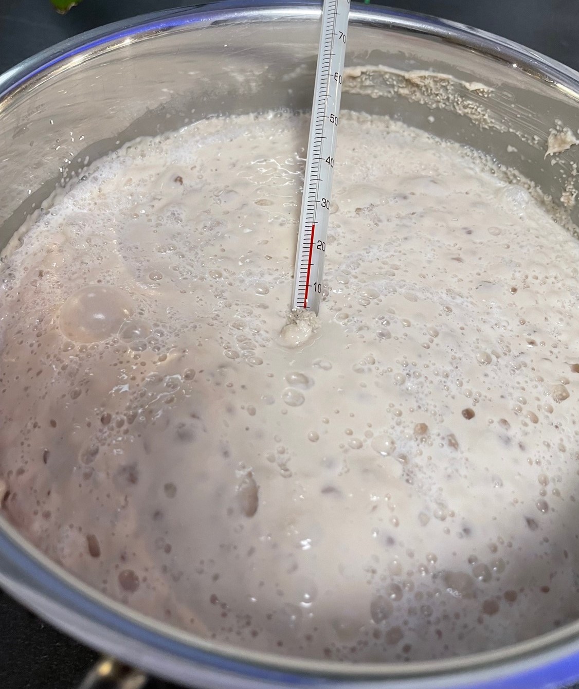 Andererseits ist es auch nicht weiter tragisch, wenn die Temp. während des Quellens leicht abfällt. Bis zum Anstellen muss der Hefebrei ja noch kühler werden.
