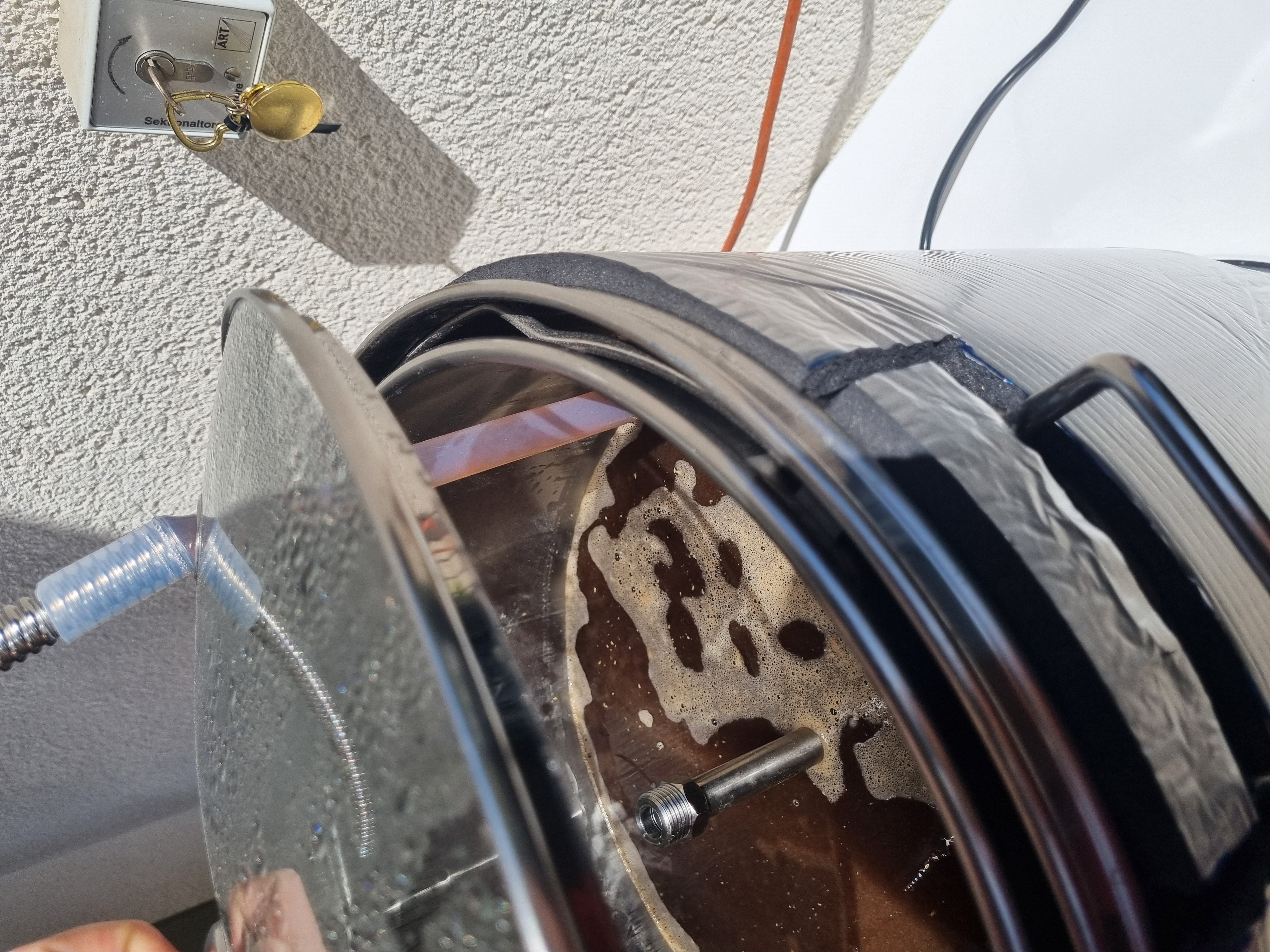 Das alles half mir aber der Situation gar nix, weil die Temperatur schon über die 19 Grad kletterte. Alle zwei Stunden muss man den Behälter mit dem kalten Wasser neu füllen. Und wenn man nicht genug Eis hat, bringt das auch nicht wirklich viel. Also kurzerhand umgebaut, den Kühlschlauch direkt an die Wasserleitung angeschlossen und auf ca. 6 Liter / Stunde Durchflussmenge eingestellt. Damit hält das Wasser im Stutzen 14,5 Grad, das Bier bleibt zumindest unter der 19-Grad-Marke. Über den Wasserverbrauch reden wir jetzt mal besser nicht. Das muss in Zukunft besser vorbereitet werden.