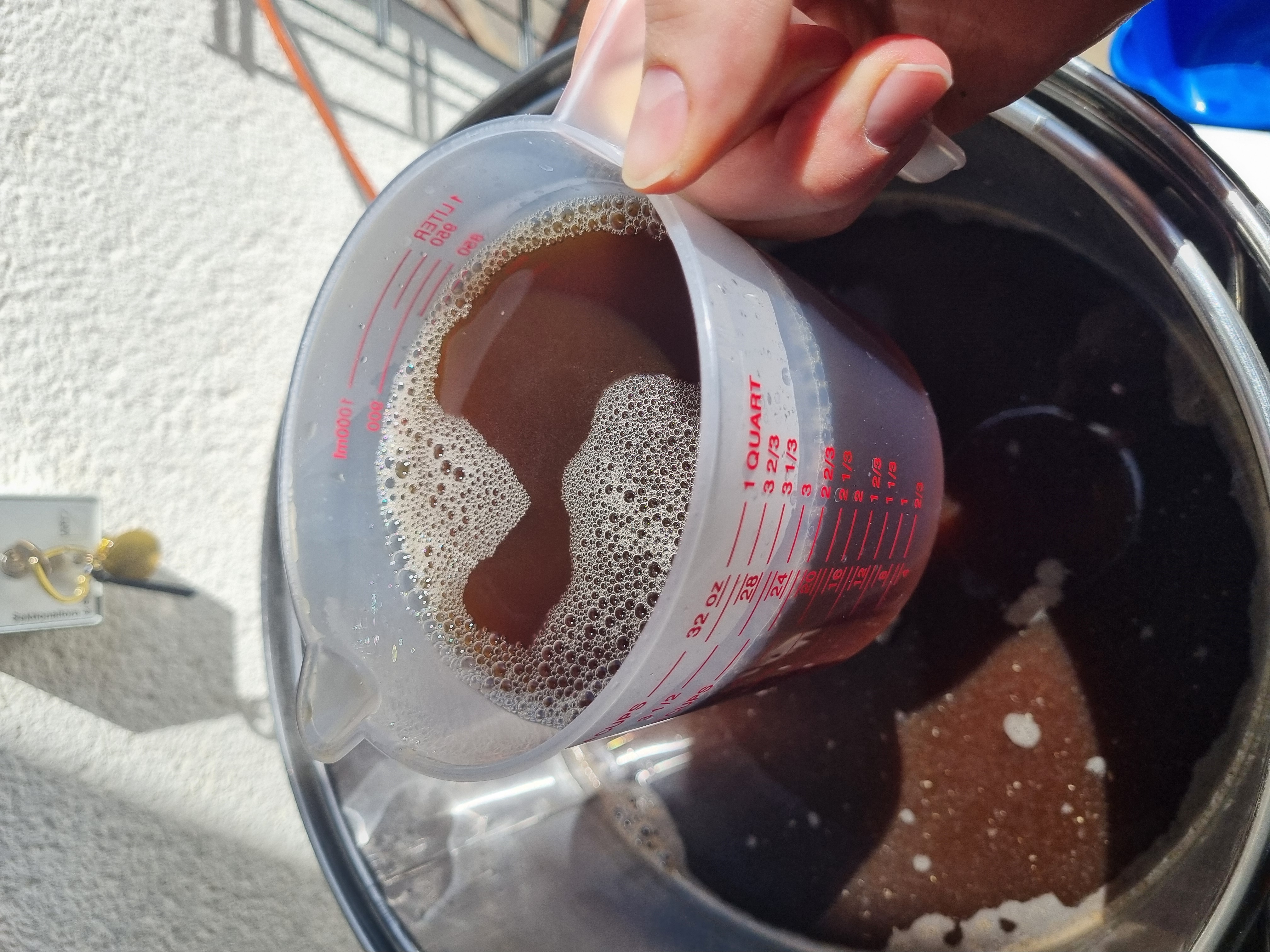 Mit der Kühlspirale wurde die Nachisomerisierung flugs beendet und dann relativ heiß in den Gäreimer umgefüllt, um noch zusätzlich zu desinfizieren. Einen Filtersack gab’s als Verhüterli. Weitergekühlt wurde dann im Gäreimer direkt, Gartenschlauch voll aufgedreht, die 20 Grad wurden in rund 50 Minuten erreicht.