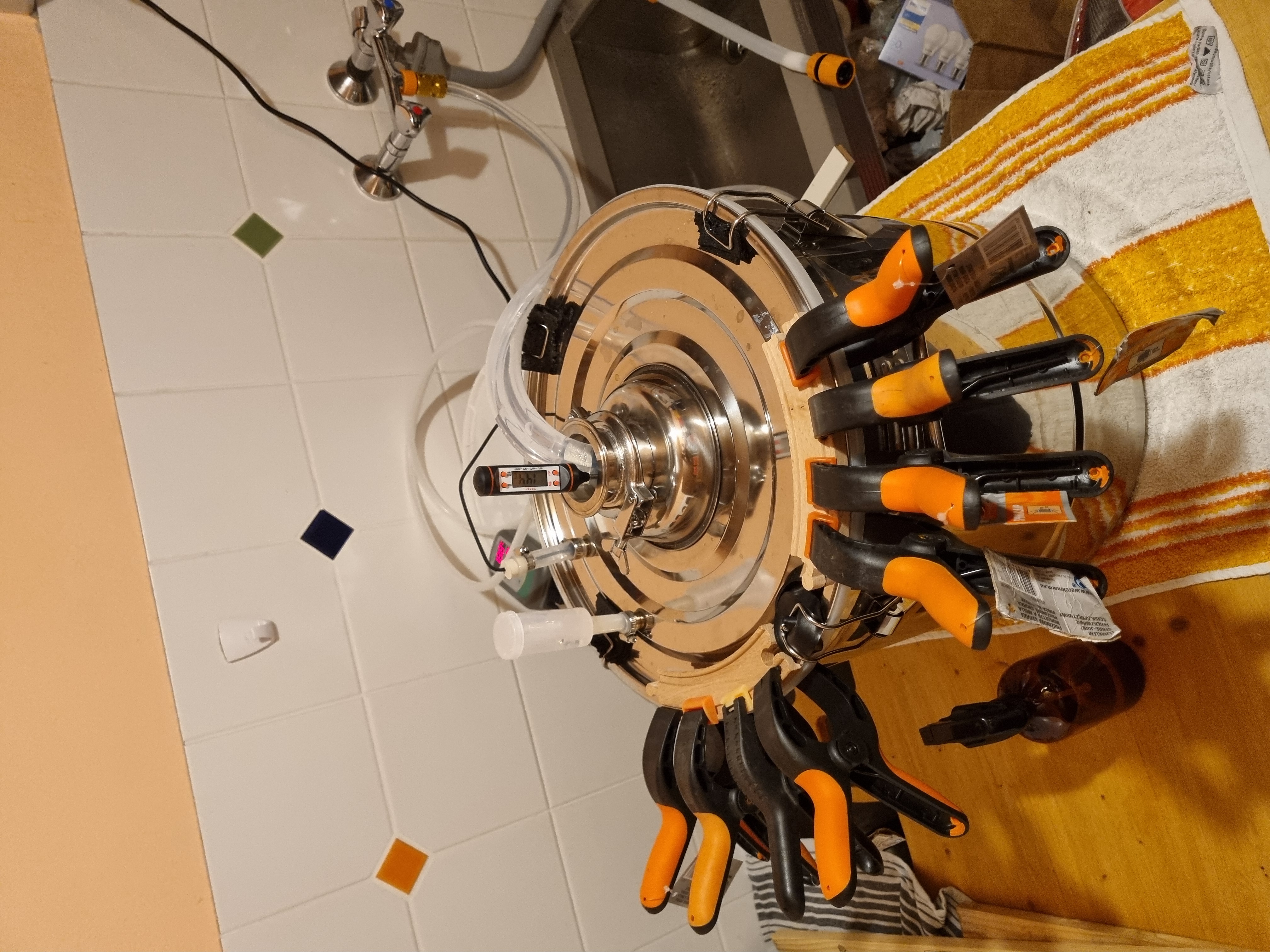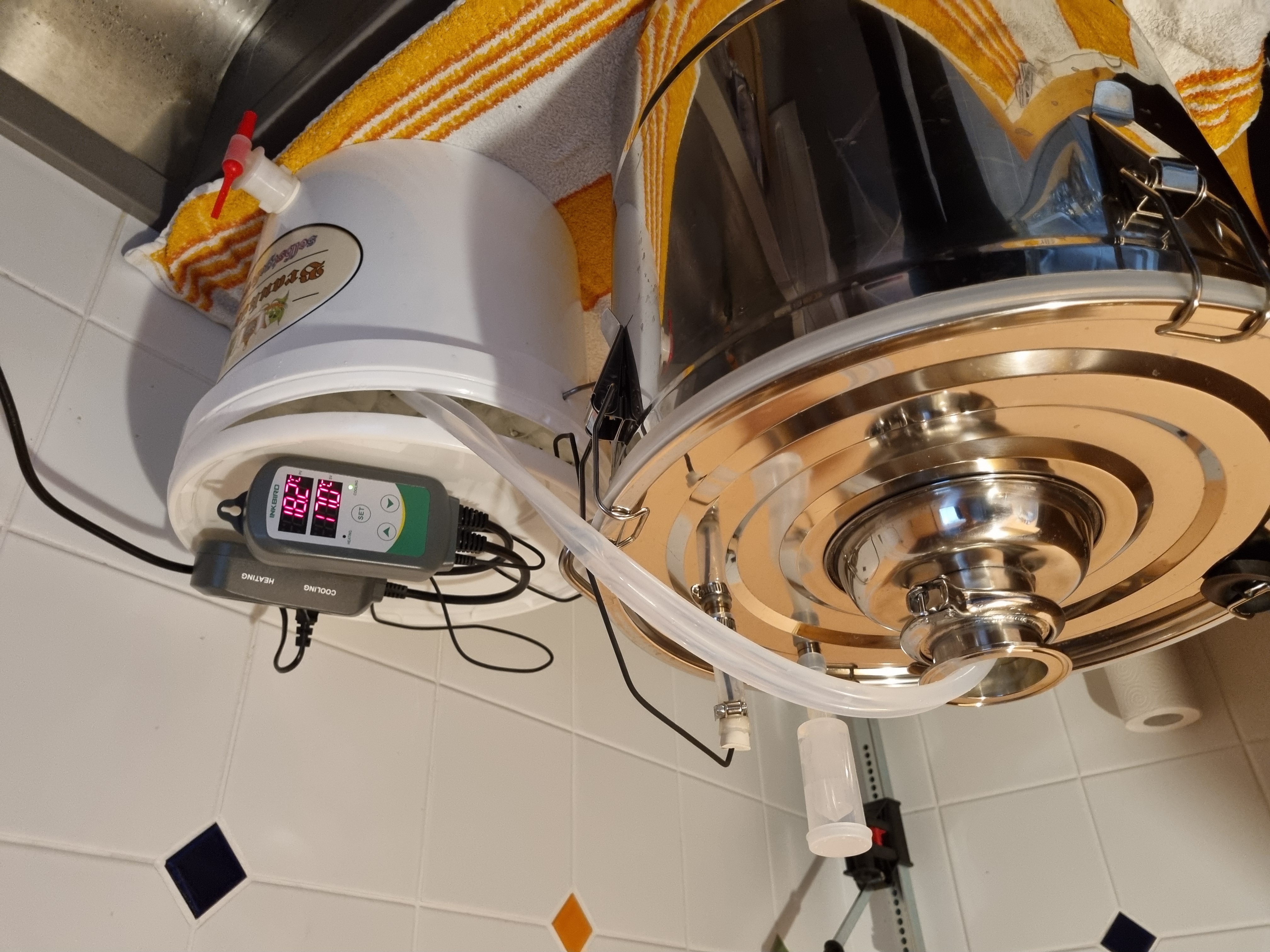 Da ein Altbier ja nicht zu warm gären darf, hab ich eine ganz primitive Gärführung gebastelt. Wärmetauscher ist der Kühlstutzen im Gärfass (ist nichts anderes als ein hohler Zylinder mit Tri-Clamp-Verschluss, der bis auf den Boden des Gärfasses reicht). Der wird per Schlauch aus einem Eimer mit Eiswasser gespeist. Geht die Temperatur des Bieres über 17,5 Grad, springt eine kleine Pumpe im Eiswasser-Eimer an und kühlt den Stutzen runter. Die Regelung übernimmt ein gewöhnlicher Inkbird, dessen Fühler im Jungbier schwimmt.