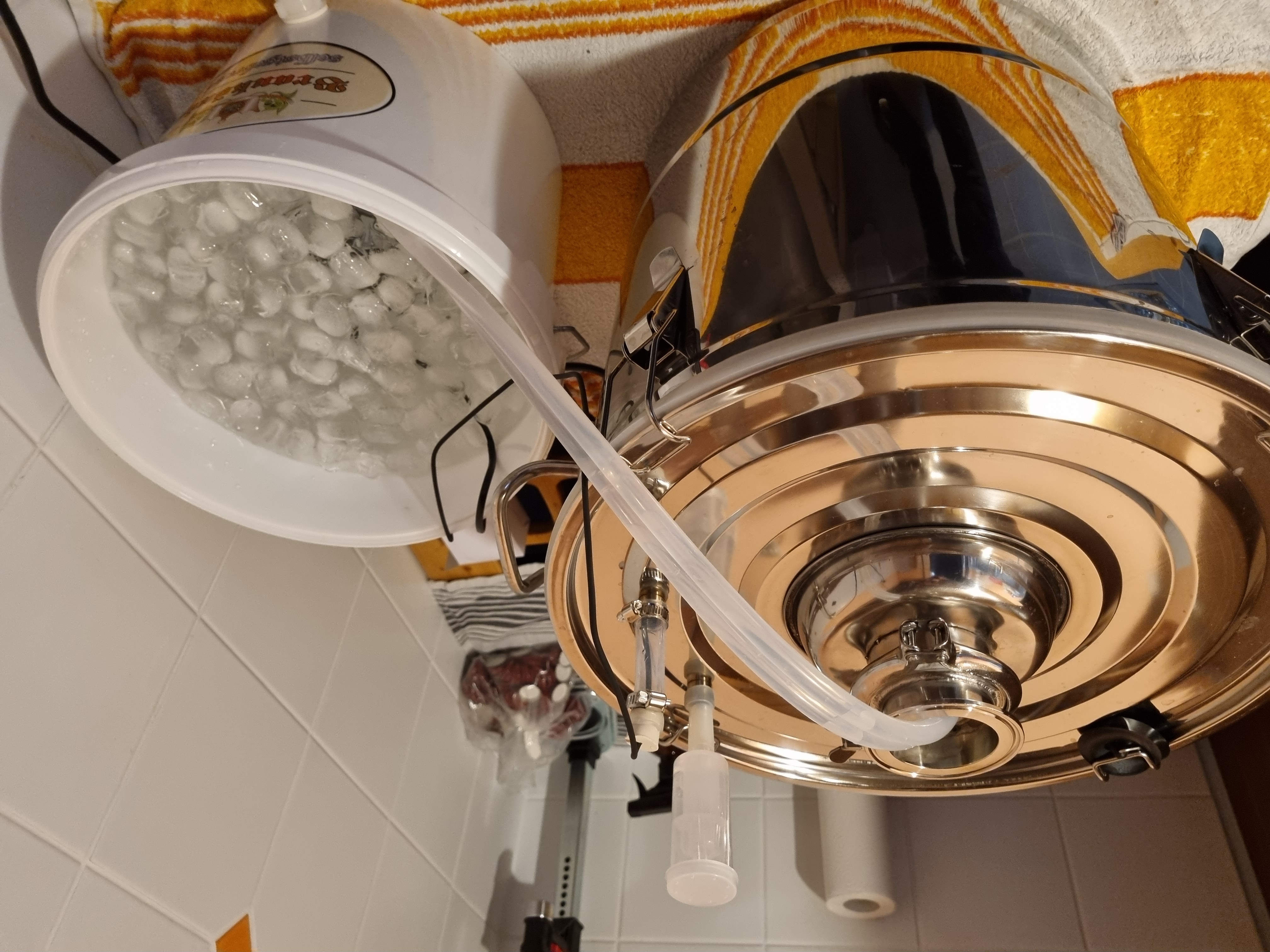 Da ein Altbier ja nicht zu warm gären darf, hab ich eine ganz primitive Gärführung gebastelt. Wärmetauscher ist der Kühlstutzen im Gärfass (ist nichts anderes als ein hohler Zylinder mit Tri-Clamp-Verschluss, der bis auf den Boden des Gärfasses reicht). Der wird per Schlauch aus einem Eimer mit Eiswasser gespeist. Geht die Temperatur des Bieres über 17,5 Grad, springt eine kleine Pumpe im Eiswasser-Eimer an und kühlt den Stutzen runter. Die Regelung übernimmt ein gewöhnlicher Inkbird, dessen Fühler im Jungbier schwimmt.