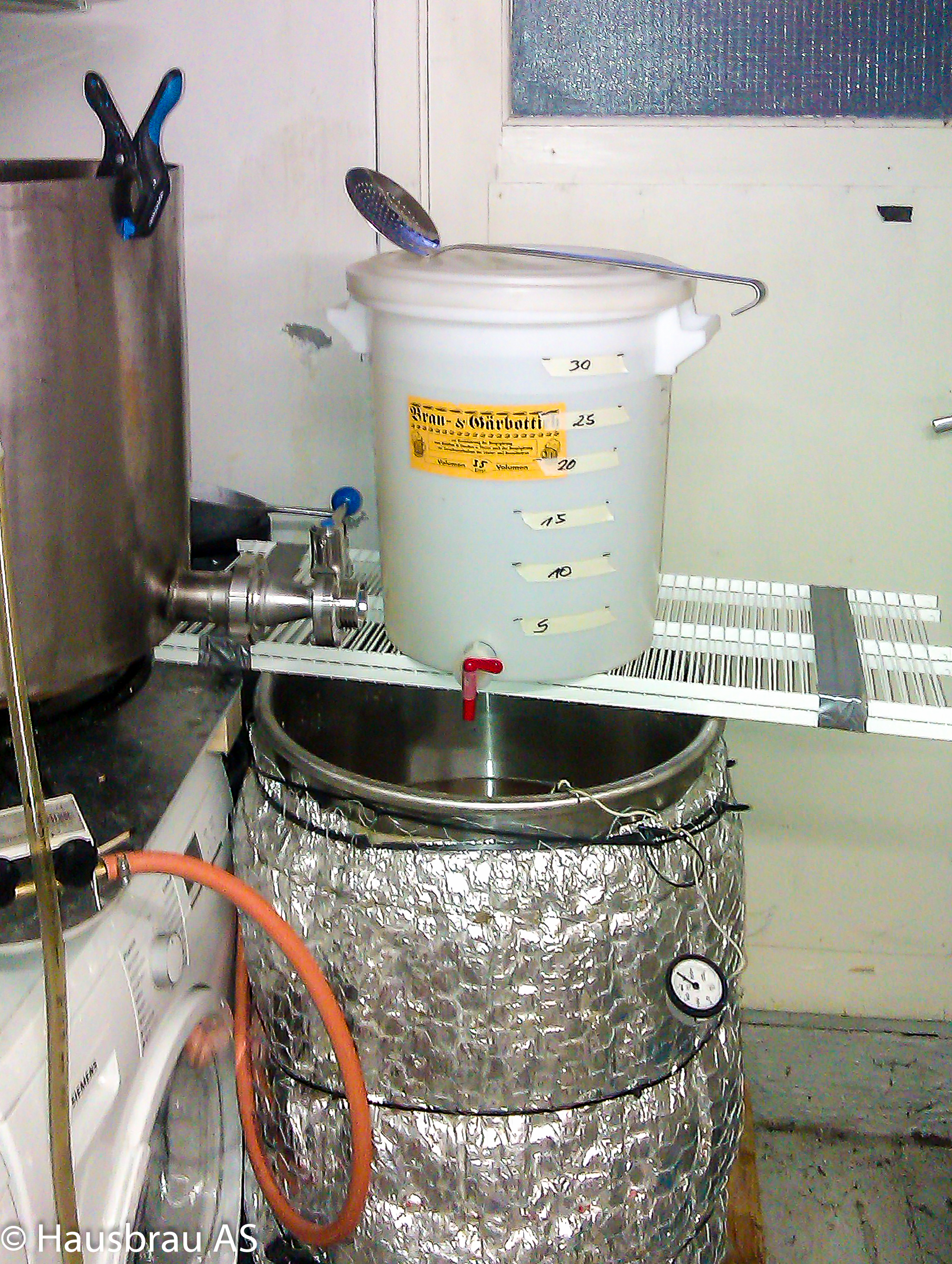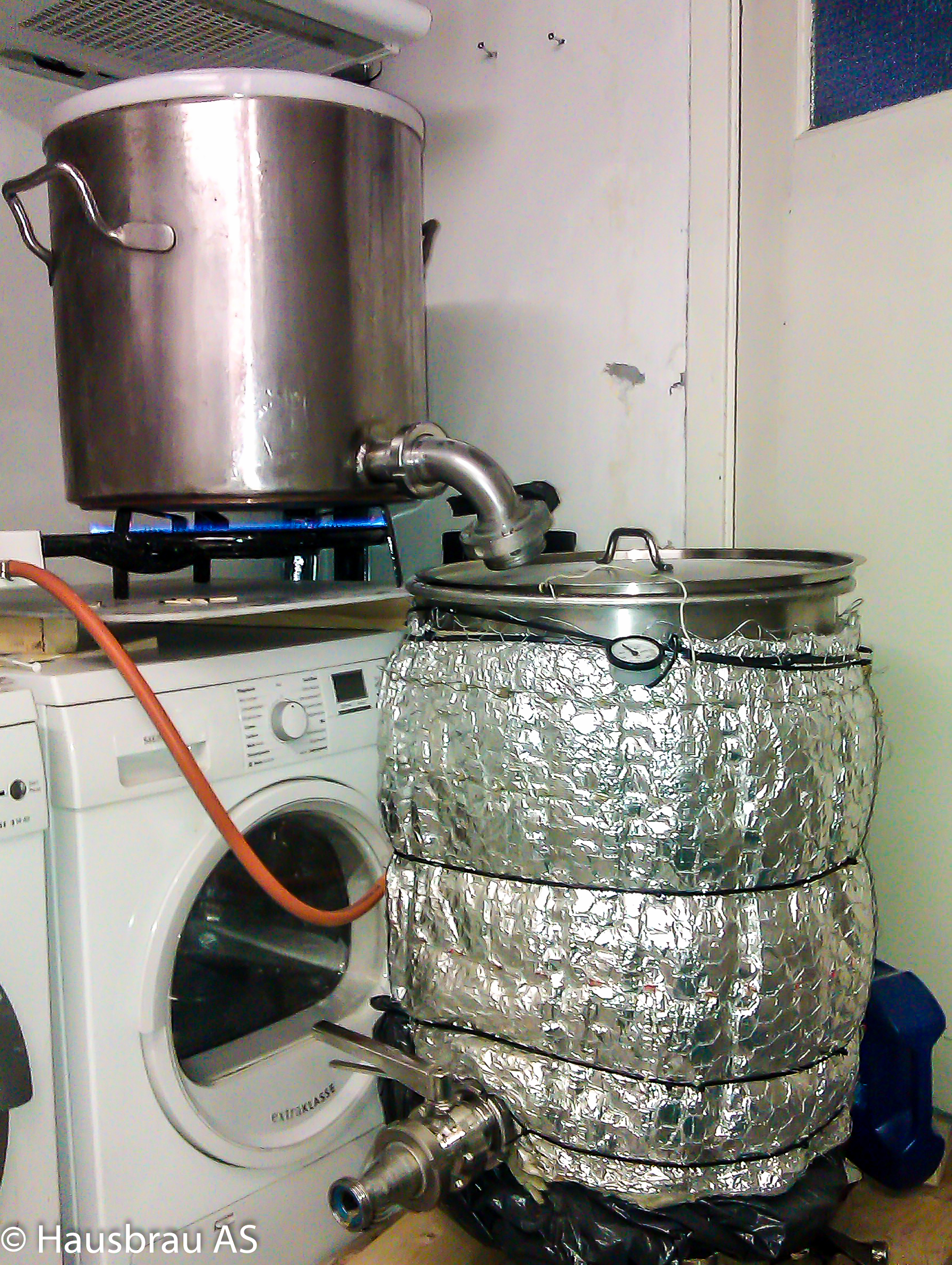 Meine Gerätschaften sind unter anderem ein Sudkessel 100ltr und ein Maischebottich 112ltr. Da ich im Keller braue nutze ich alle Geräte wie den Trockner zum Brauen.