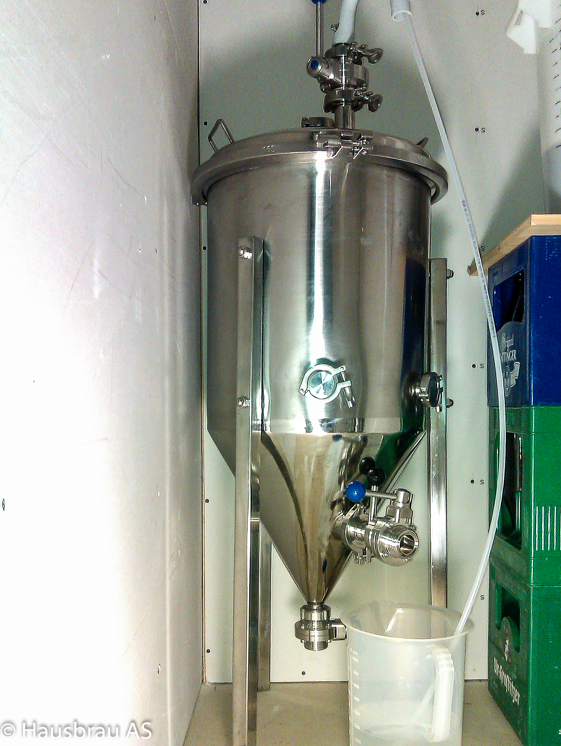 Nach dem Hopfenkochen hab ich die Würze mit der Pumpe durch den Gegenstromkühler in den ZKG gepumpt und dort mit rund 520ml WLP 802 angestellt. Gärung kam innerhalb 12h an. Und es blubbert schön im Messbecher. Der ZKG steht in der Kühlzelle damit die Würze eine ideale Temperatur zum vergären hat.