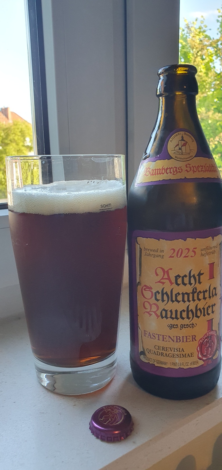 Schlenkerla Fastenbier. Mit 5,9 % vol. alc. sehr nahrhaft. Volles, fast cremiges Mundgefühl. Laut Etikett angeblich nur mildes Rsucharoma. Ich finde es hingegen Schlenkerla-typisch sehr prominent. Aber ich find's gut, insgesamt sehr guter Stoff (auch außerhalb der Fastenzeit).