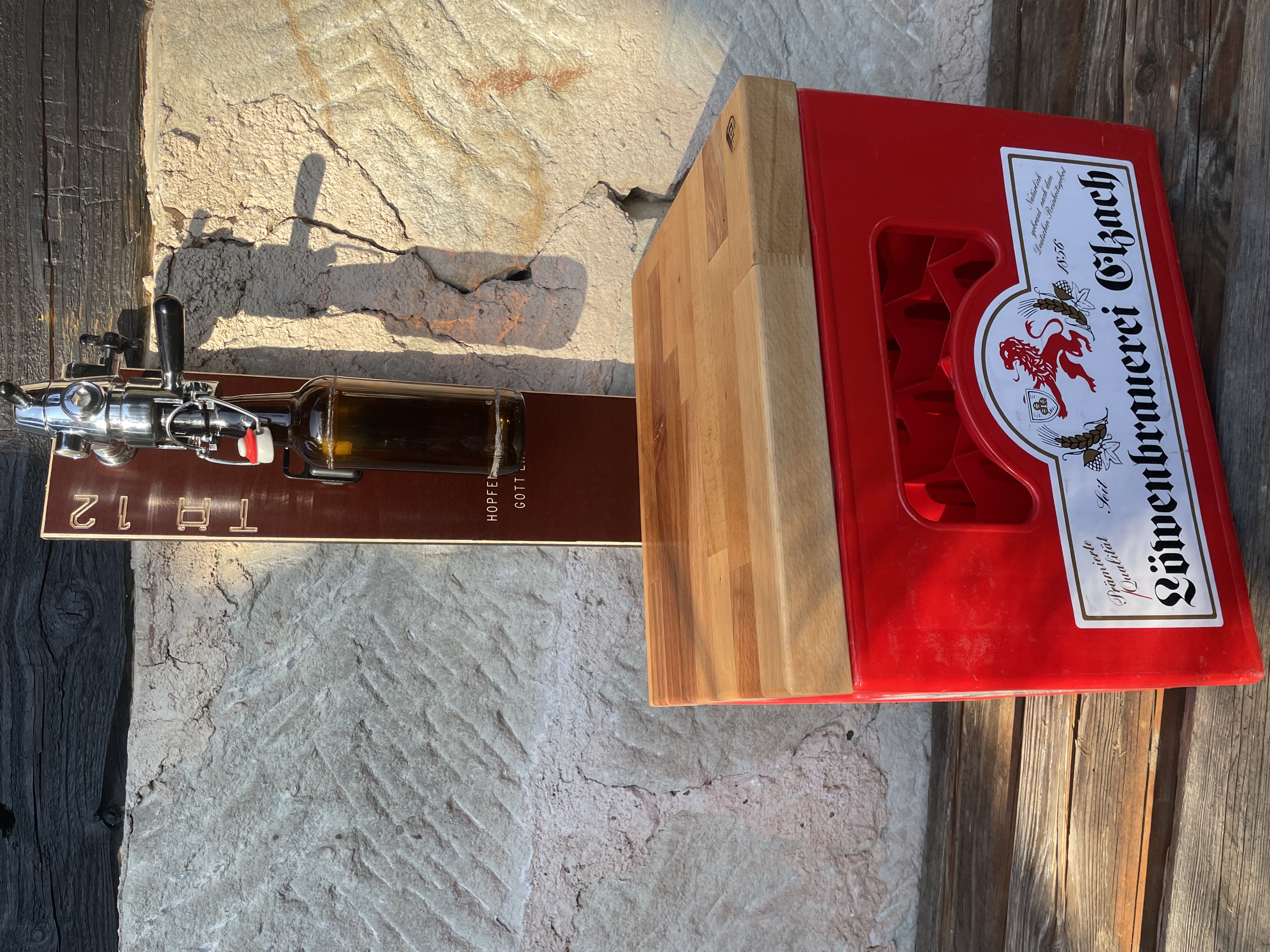 ich habe mir -nachdem ich inzwischen unter Druck vergäre- Gedanken über einen Gegendruckabfüller machen müssen. Nachdem das schicke Gerät diese Woche ankam und ich gestern zum basteln kam, habe ich das Teil wie auf den Bildern zu sehen montiert. Leider haben meine Schläuche und Anschlüsse nicht gepasst, daher kann ich über die Funktionalität noch nichts sagen. Sollte hier schon jemand sein, der mit dem Gerät Erfahrungen hat, würde ich mich über den Erfahrungsaustausch freuen…