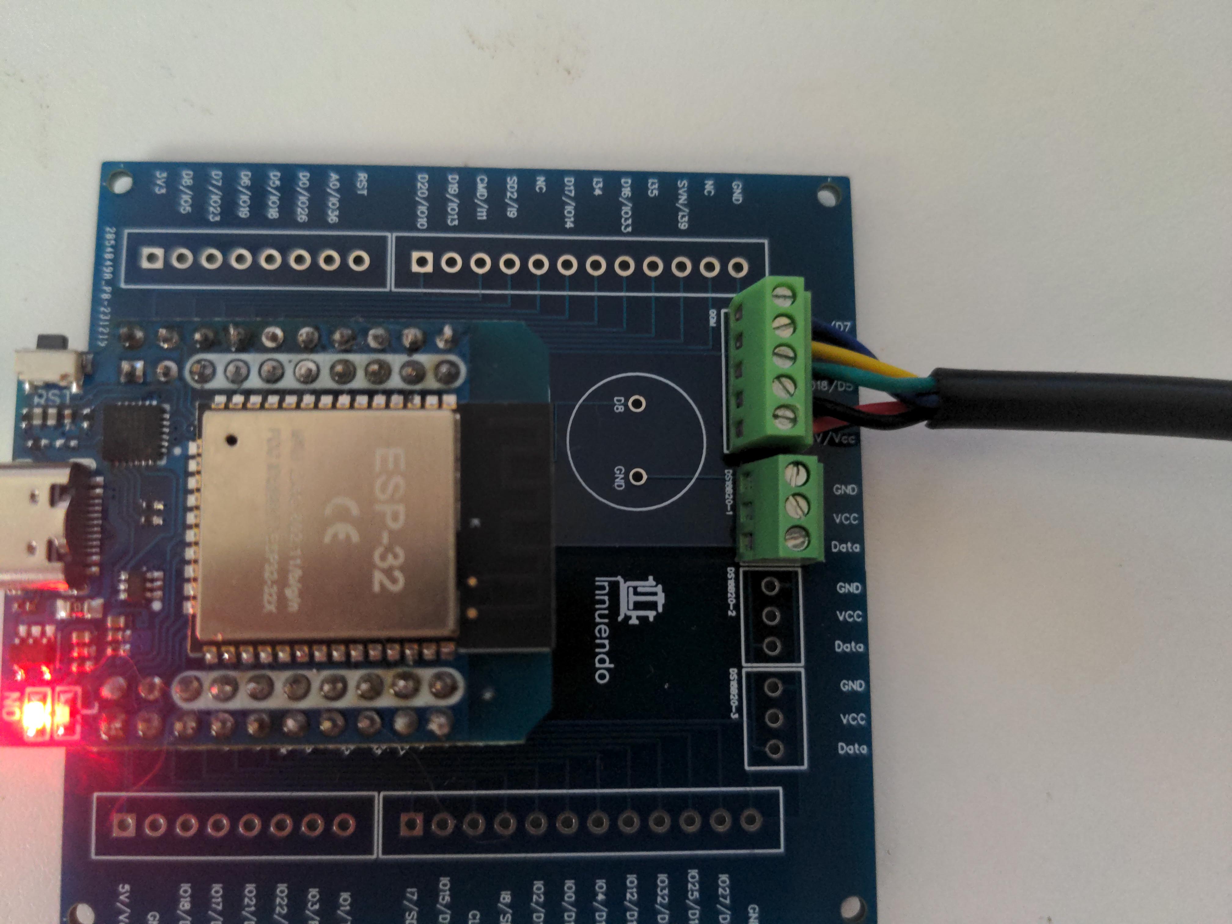 - 5V/VCC und GND am rechten unteren Rand der Platine (wenn der ESP-USB-Anschluss nach unten zeigt)