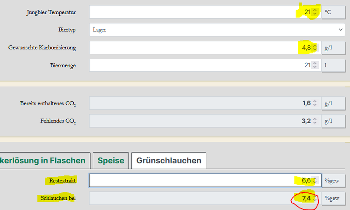 branch hat geschrieben: Mittwoch 30. Juli 2025, 16:49 ... Jetzt habe ich grad wieder einen Sud gemacht und habe mir überlegt grün in die Flaschen zu schlauchen. Bräureka sagt mir, dass ich mit SW 6.6°P und einem SRE von 5.8 (bei Gärtemperatur von 21°C und Ziel 4.8 g/l CO2) bei 6.6°P grün schlauchen soll ... also eigentlich grad nach dem Anstellen. Kann das sein?