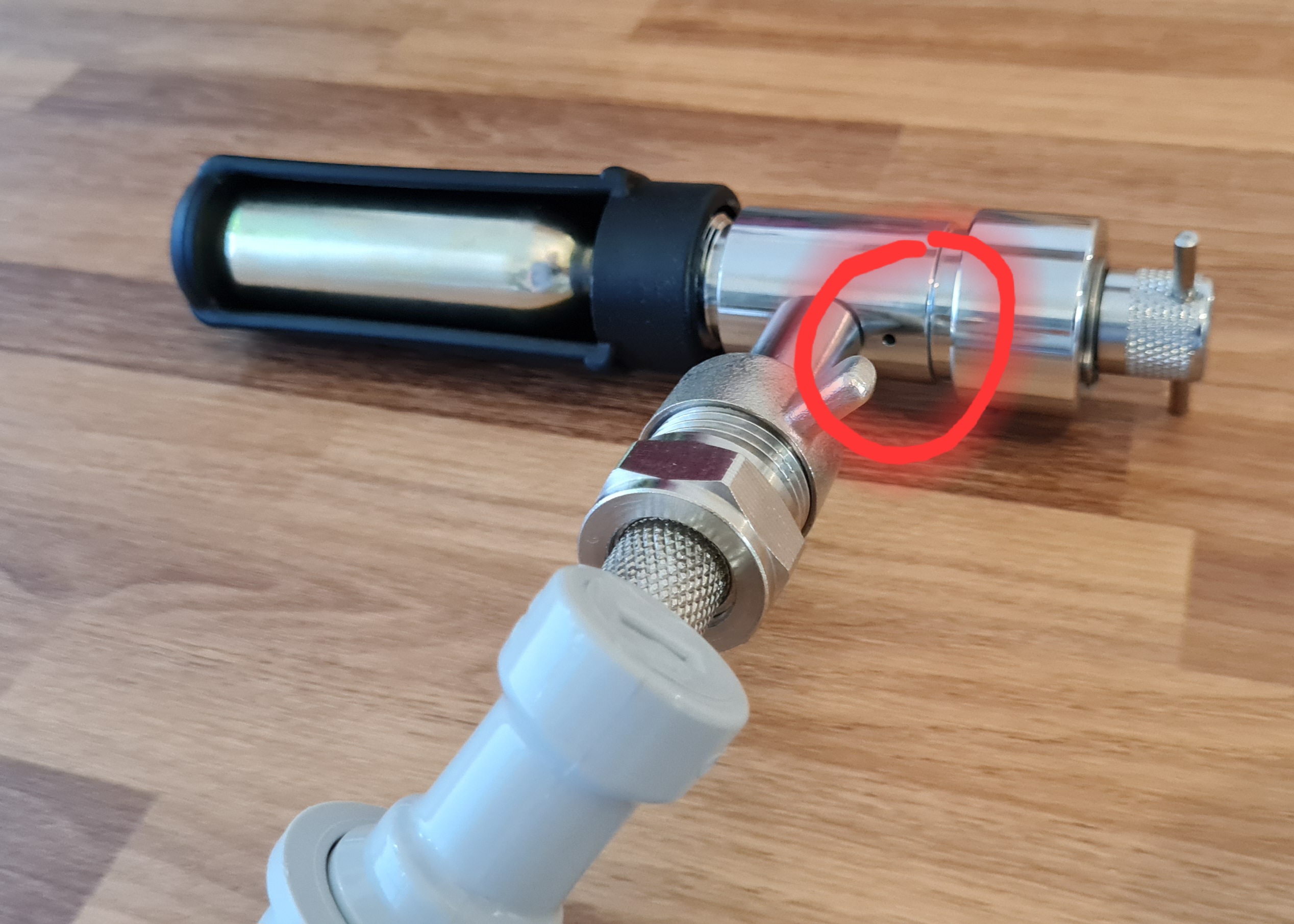 Alles ist dicht, bis ich die NC-Kupplung aufstecke. Dann kommt das Gas aus dem kleinen Loch geströmt (Überdruckventil?). Im Fass kommt dann jedoch kein Gas an. Am Fass liegt es nicht, denn mit meiner großen Gasflasche funktioniert alles wie gewohnt. Hat jemand eine Idee, was hier schief läuft?