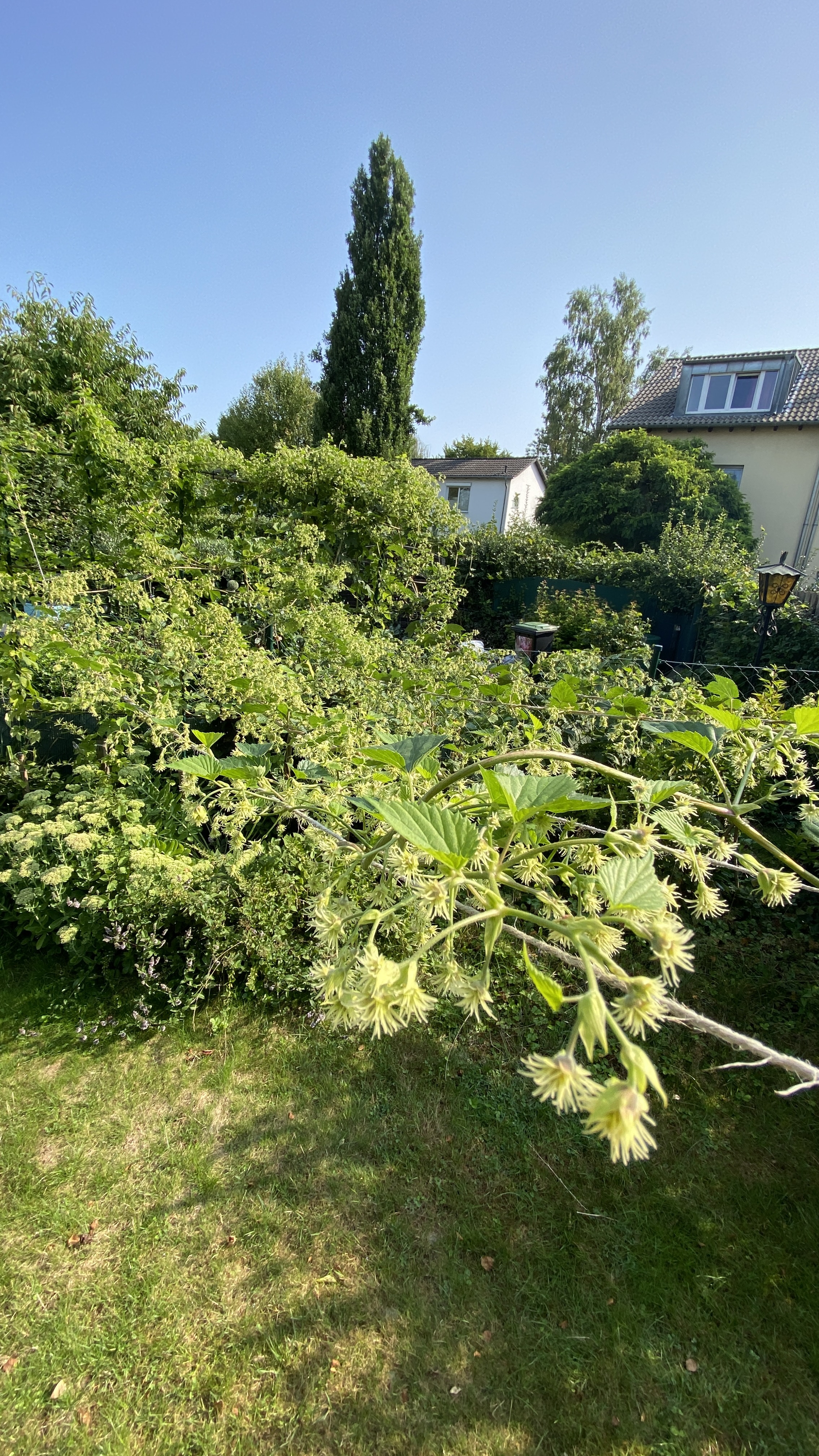 Mein Tango hat bereits einige Dolden ganz da, während anderswo noch die Blüten aufgehen. Ziemlicher Kontrast. Aber bis die Dolden aromatisch werden, dauert es eh noch drei Wochen.