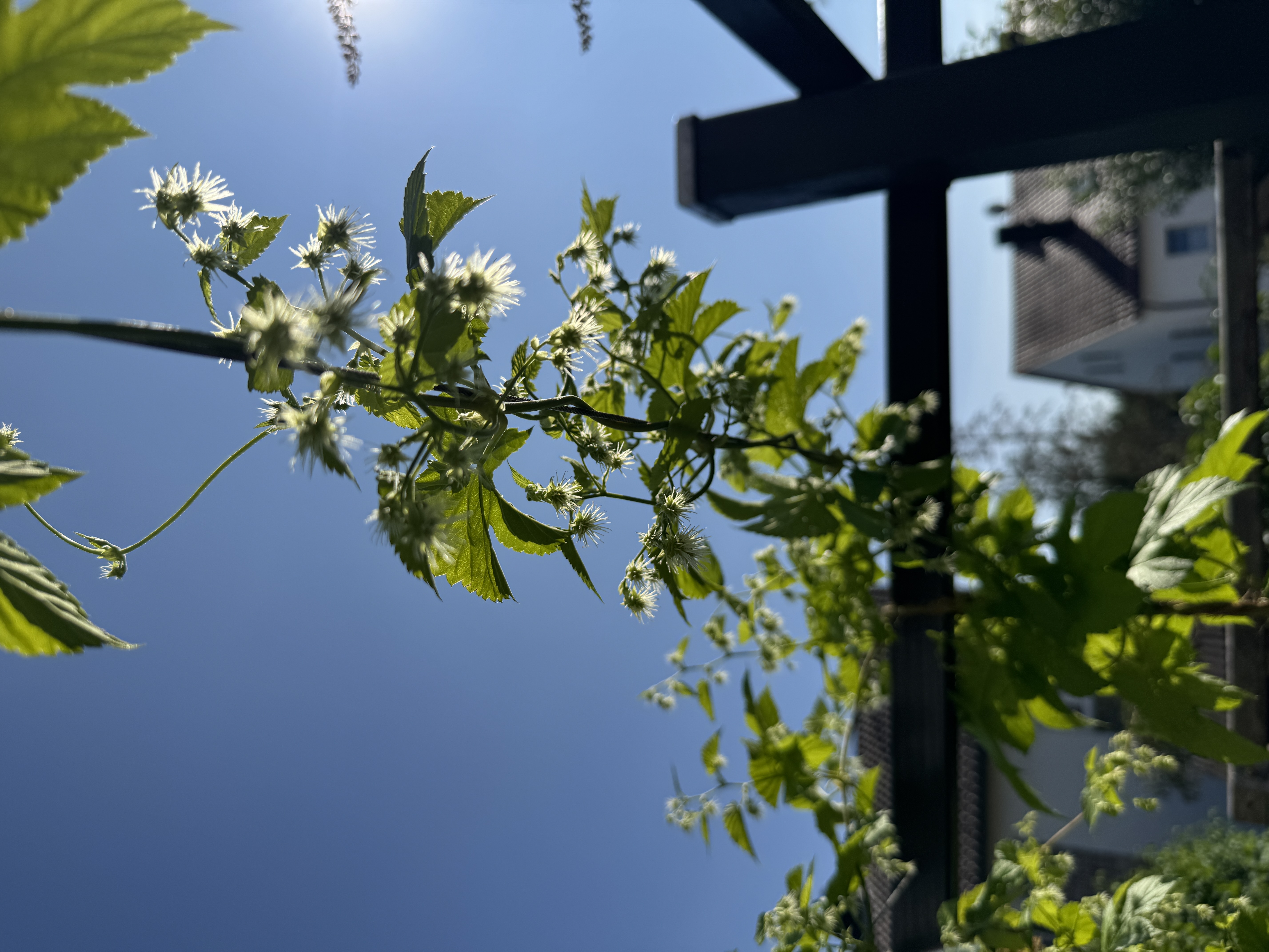 Habe dafür eine einfache Pergola gebaut, mit dem Ziel, etwas Schatten zu bekommen und am Ende der Saison ein paar schöne Biere mit frischem Hopfen zu verfeinern.