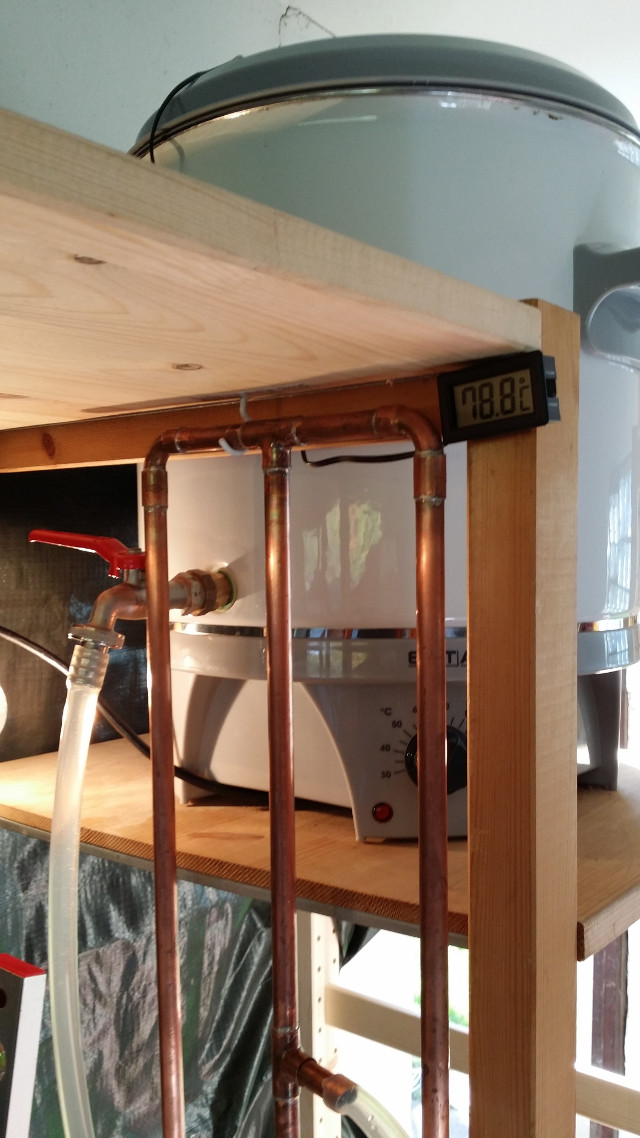 Im nächsten Bild dann Neuerung 8: Ein Brautisch, selbst gebastelt. Hier steht der Kessel zum Wirlpool auf zwei Fliesen auf dem Brautisch.