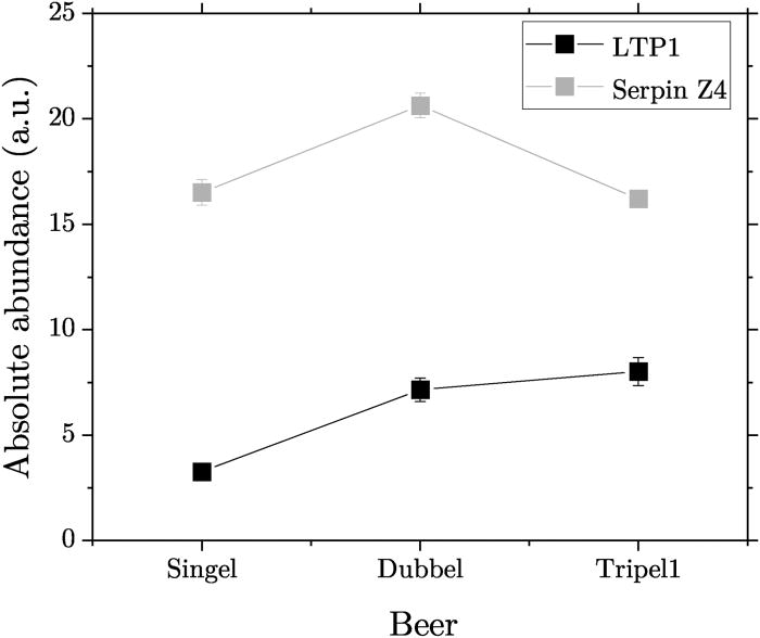 Die Termini LPT1 und Serpin Z4 werden synonym für Protein und Proteingehalt verstanden.Absolute abundances of LTP1 (black) and Serpin Z4 (gray), as measured by DIA/SWATH (data-independent acquisition sequential window acquisition of all theoretical mass spectra) in the three beers (single-, double-, and triple-fermented).