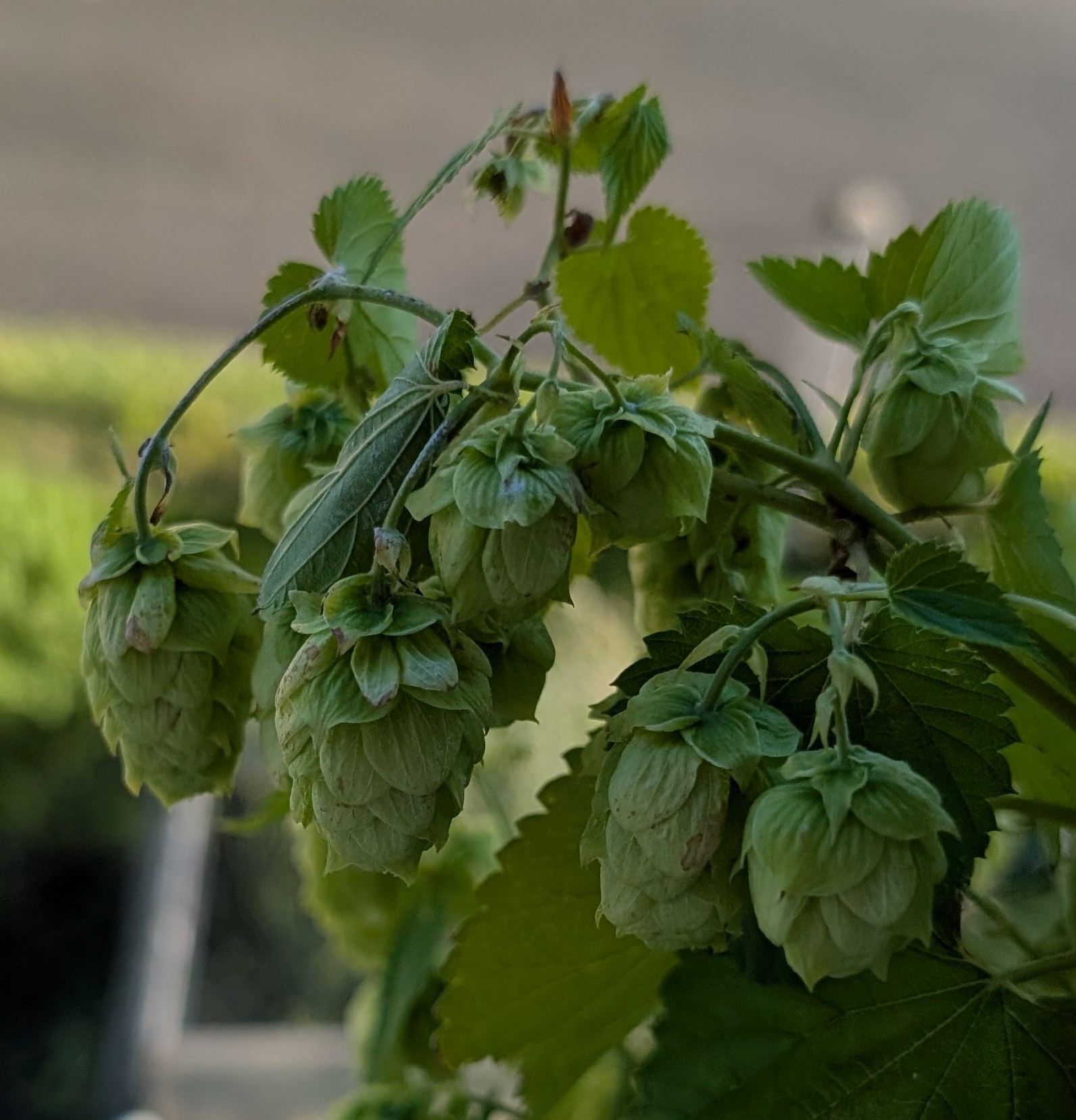 Ich habe heute morgen noch mal nach dem Hopfen gesehen. Er raschelt, die äußeren Blätter fallen leicht ab, wenn man die Dolden zwischen den Fingern reibt, sie brechen leicht durch, duften zitronig. Ich werde am Wochenende wohl ernten können.