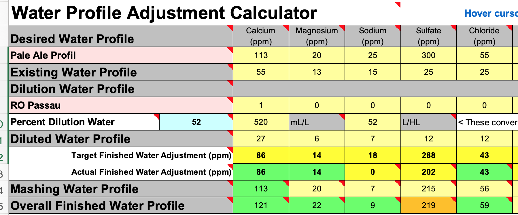 Die beiden Zielprofile müssen möglichst übereinstimmen. Das steht so auch in der Anleitung. Dabei ist das Target Finished Water Adjustment vorgegeben und mit dem Actual Finished Water Adjustment wird eingestellt. Gesteuert wird diese Anpassung über die Salzgaben und den Prozentwert Percent Dilution Water.