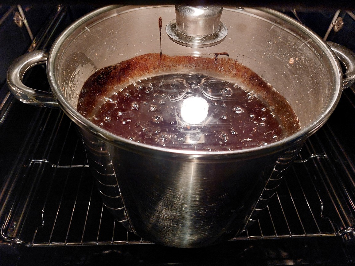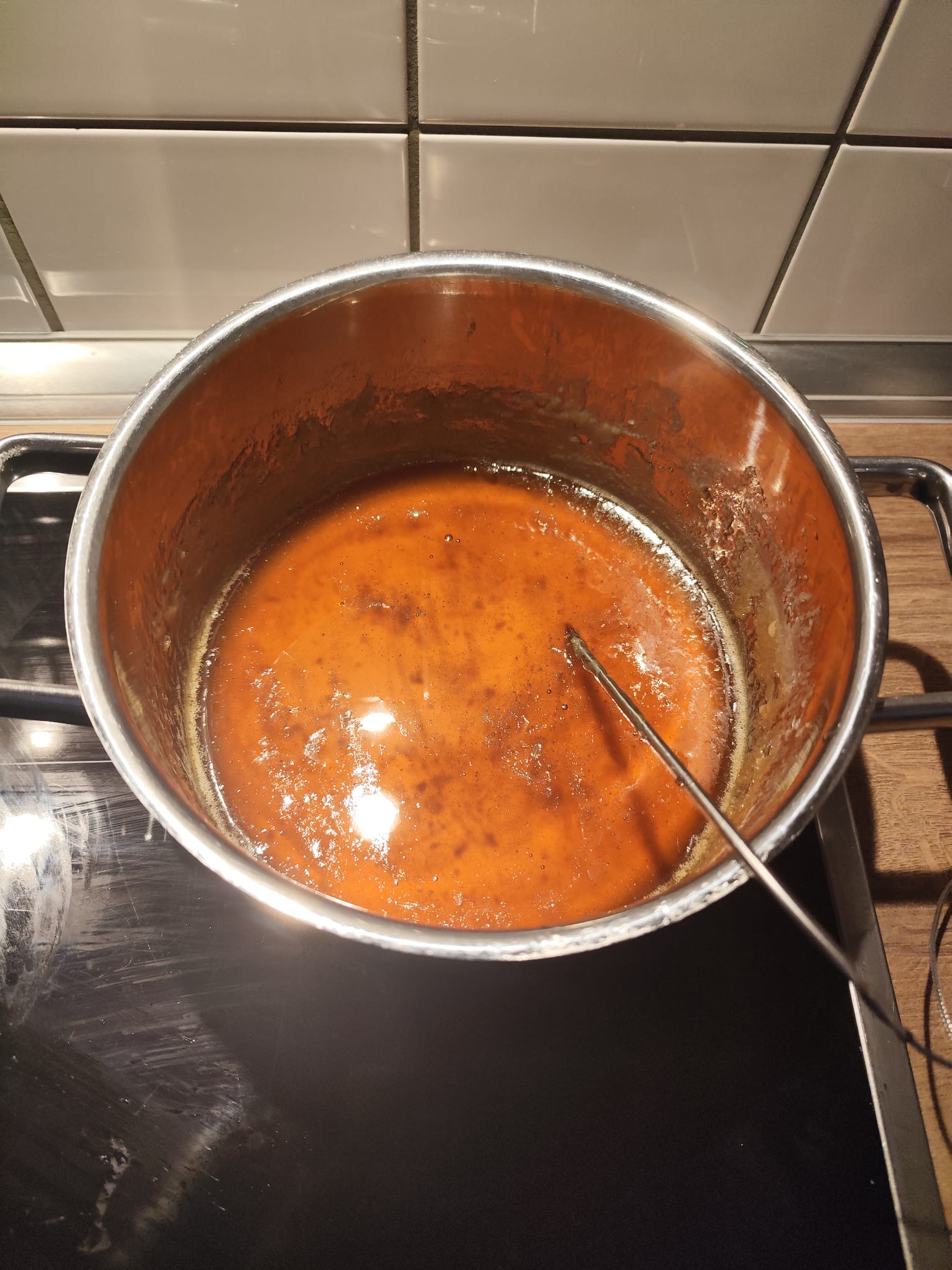 So sieht mein Weg zum belgischen (also mit Ca(OH)2 und Hefenährpulver) Sirup aus, inkl. Zuckerrübensirup. Leider habe ich kein 200 °C Thermometer, dem Ofen vertraue ich aber halbwegs. Musste ganz schön lange auf 145 °C bleiben für die Farbe. So extrem aromatisch kommt mir der Saft aber ehrlich gesagt auch wieder nicht rüber, die Süße erschlägt alle meine Geschmackknospen