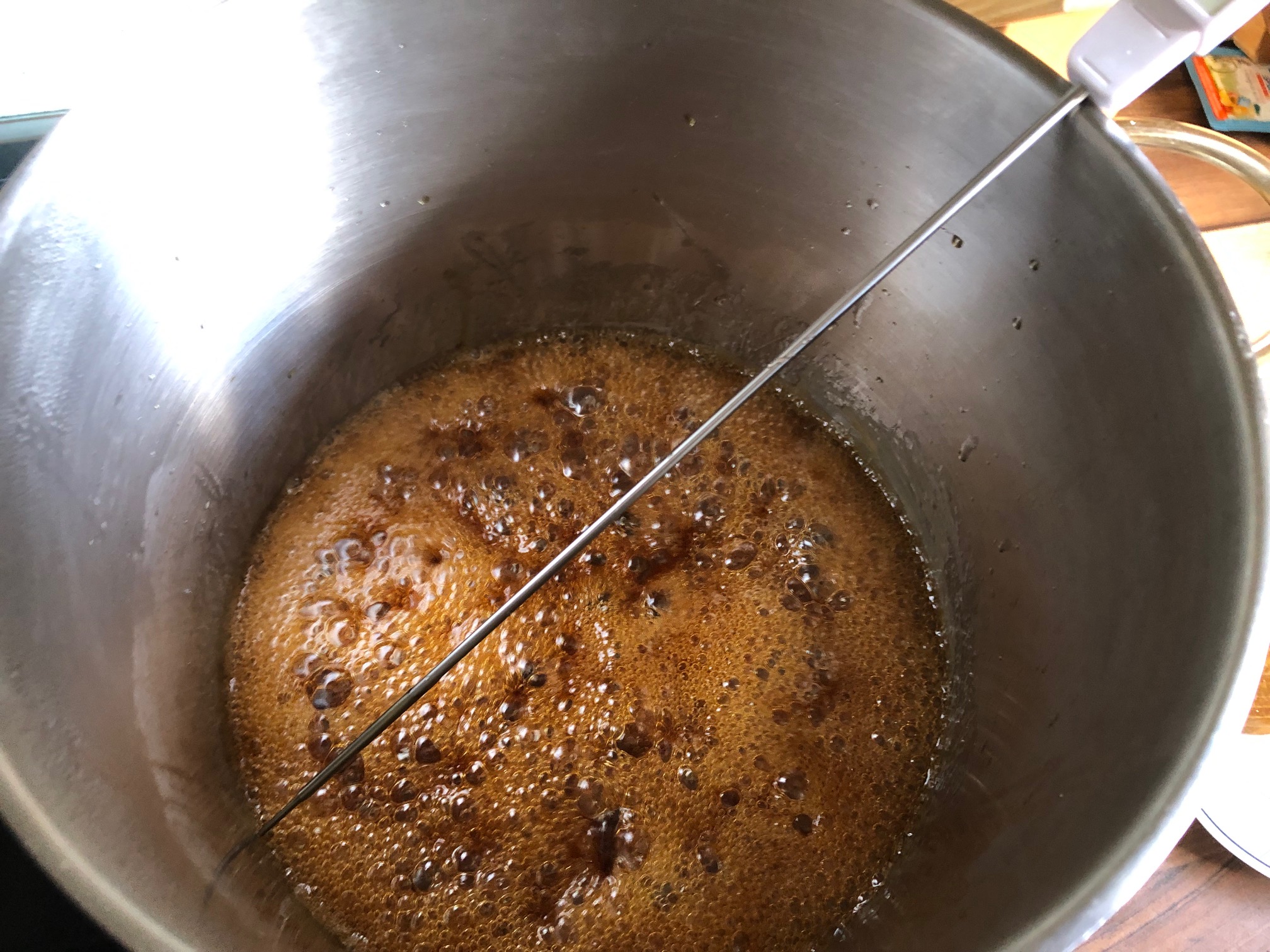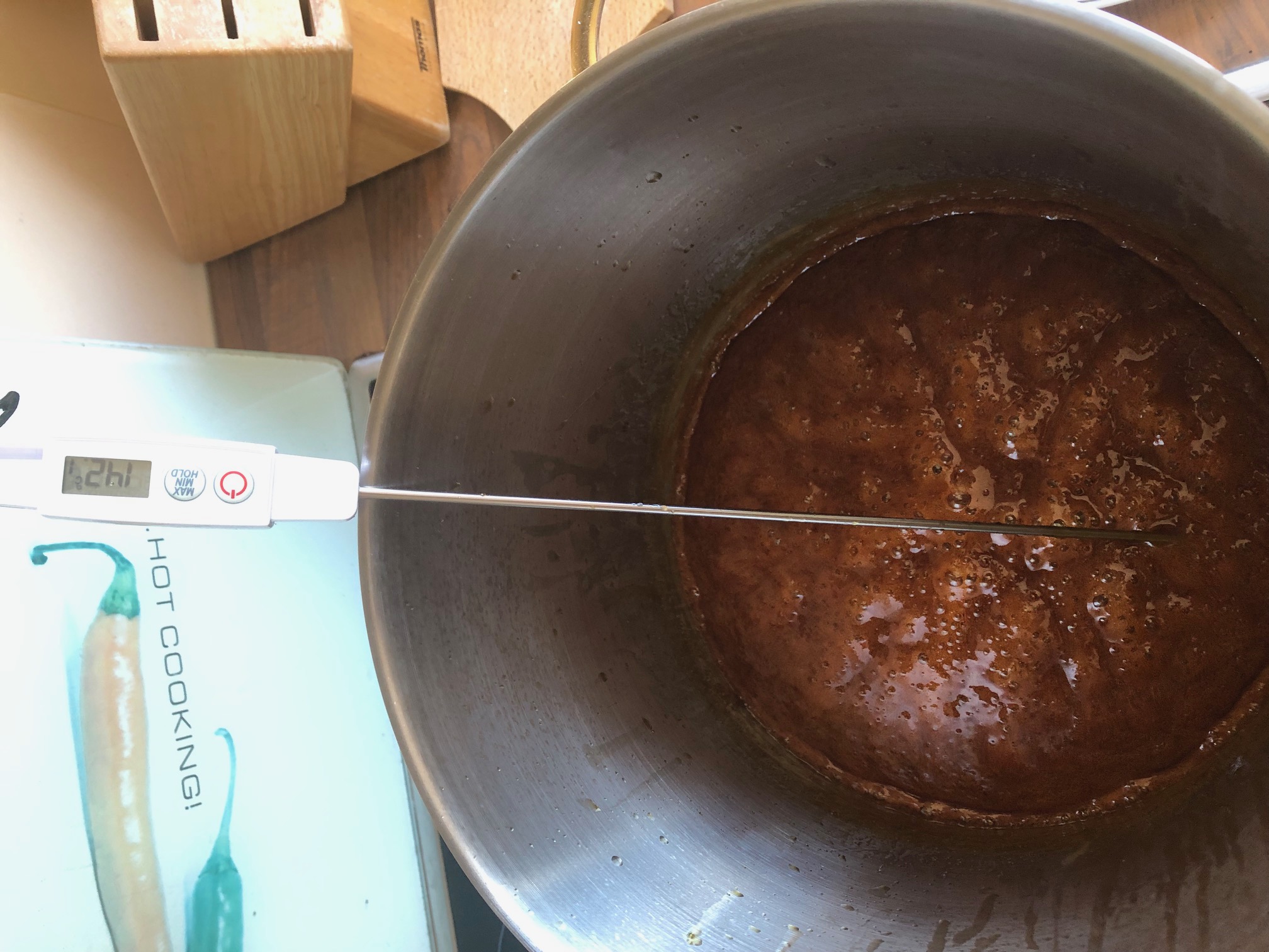 Als ich das erste Mal über 135°C kam, fügte ich zwei EL hinzu. Ergebnis: sofortige Kristallisation von 1kg heißem Zucker, Rühren war quasi nicht mehr möglich, nur noch Kratzen. Auch nach einer weiteren Verdünnung und abermaligem Aufheizen das gleiche Ergebnis.