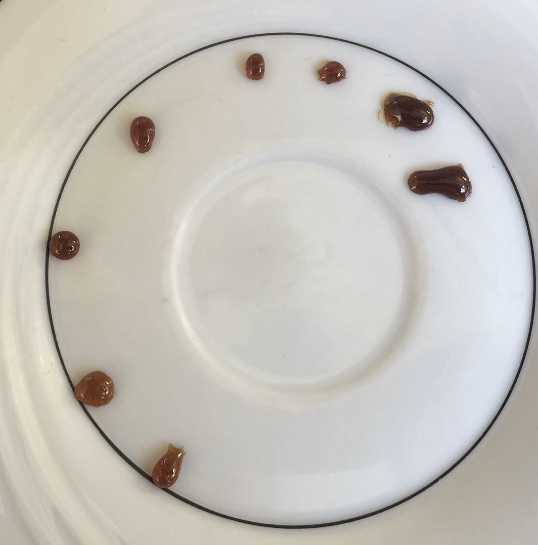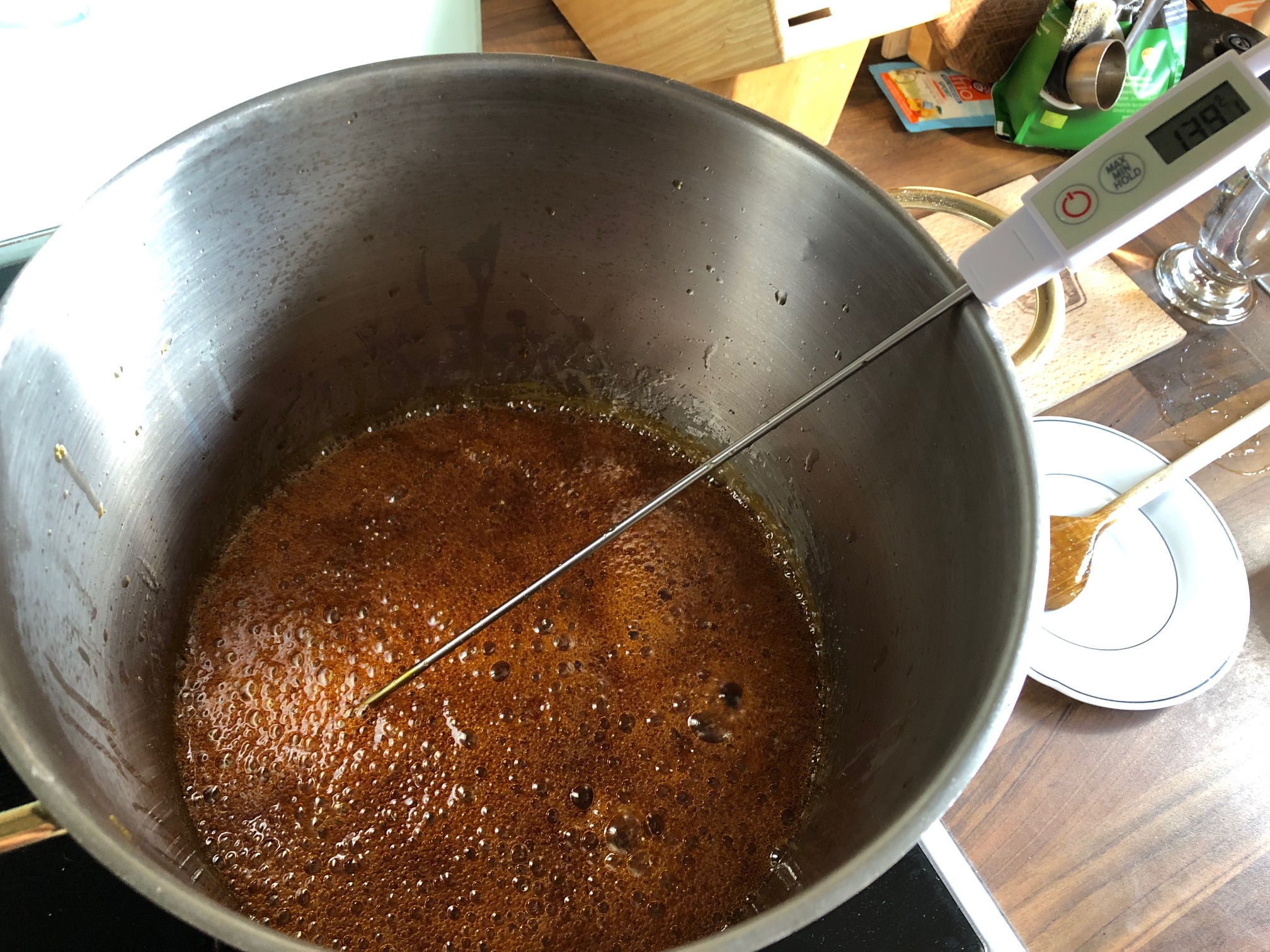 Anbei ein paar Bilder. Das vorletzte Bild zeigt etwas von dem im Topf gebliebenen Rest, den ich mit etwas Wasser gelöst habe — nur als Anhalt, wie dunkel die Farbe letztlich geworden ist. Tatsächlich fand der Hauptfarbumschwung erst deutlich jenseits der 150° statt, so bei 160° bis 165°, vorher war es eher ein golden candy sugar. Man kann das einigermaßen auf den kleinen Proben auf der Untertasse sehen.
