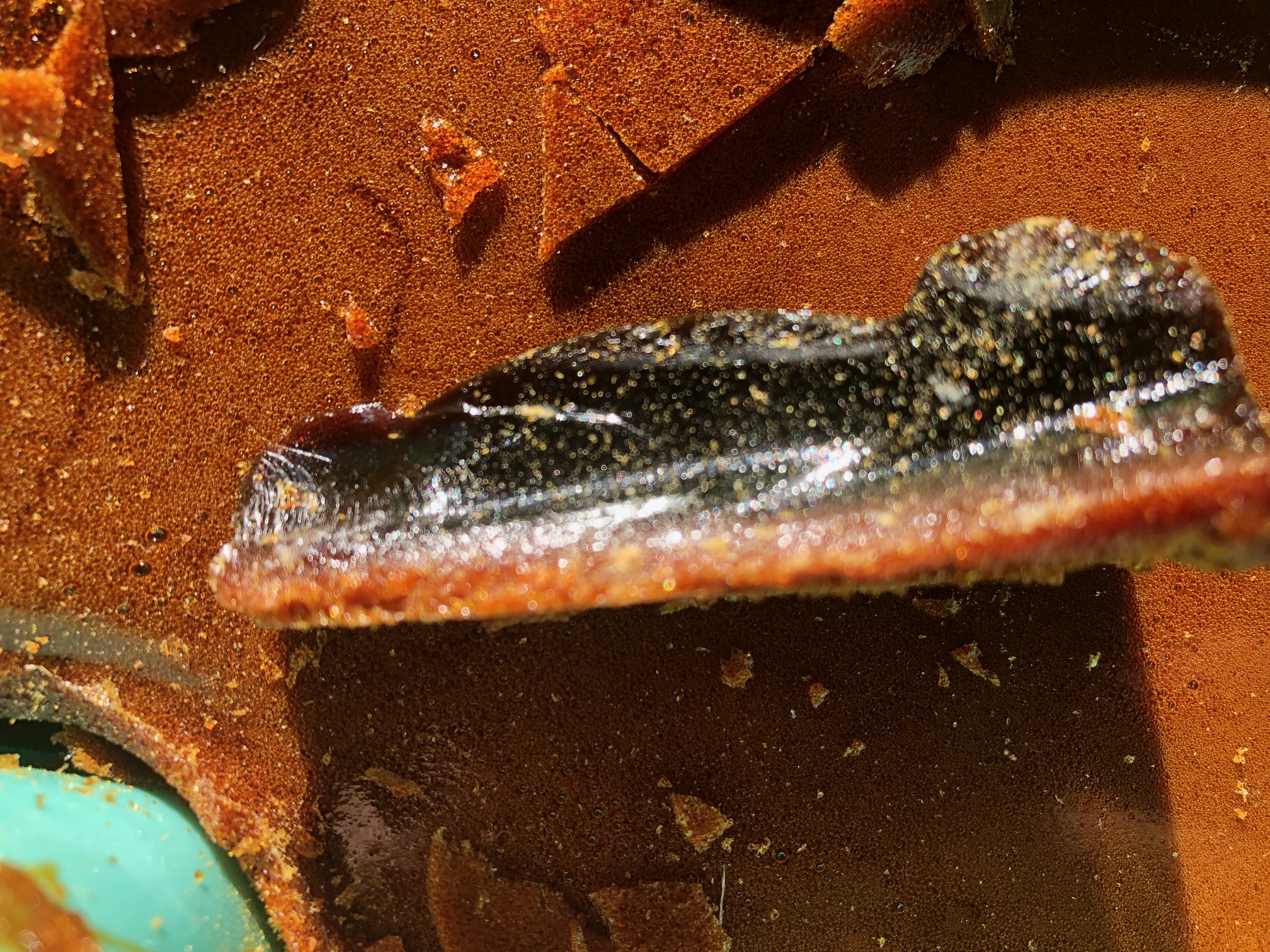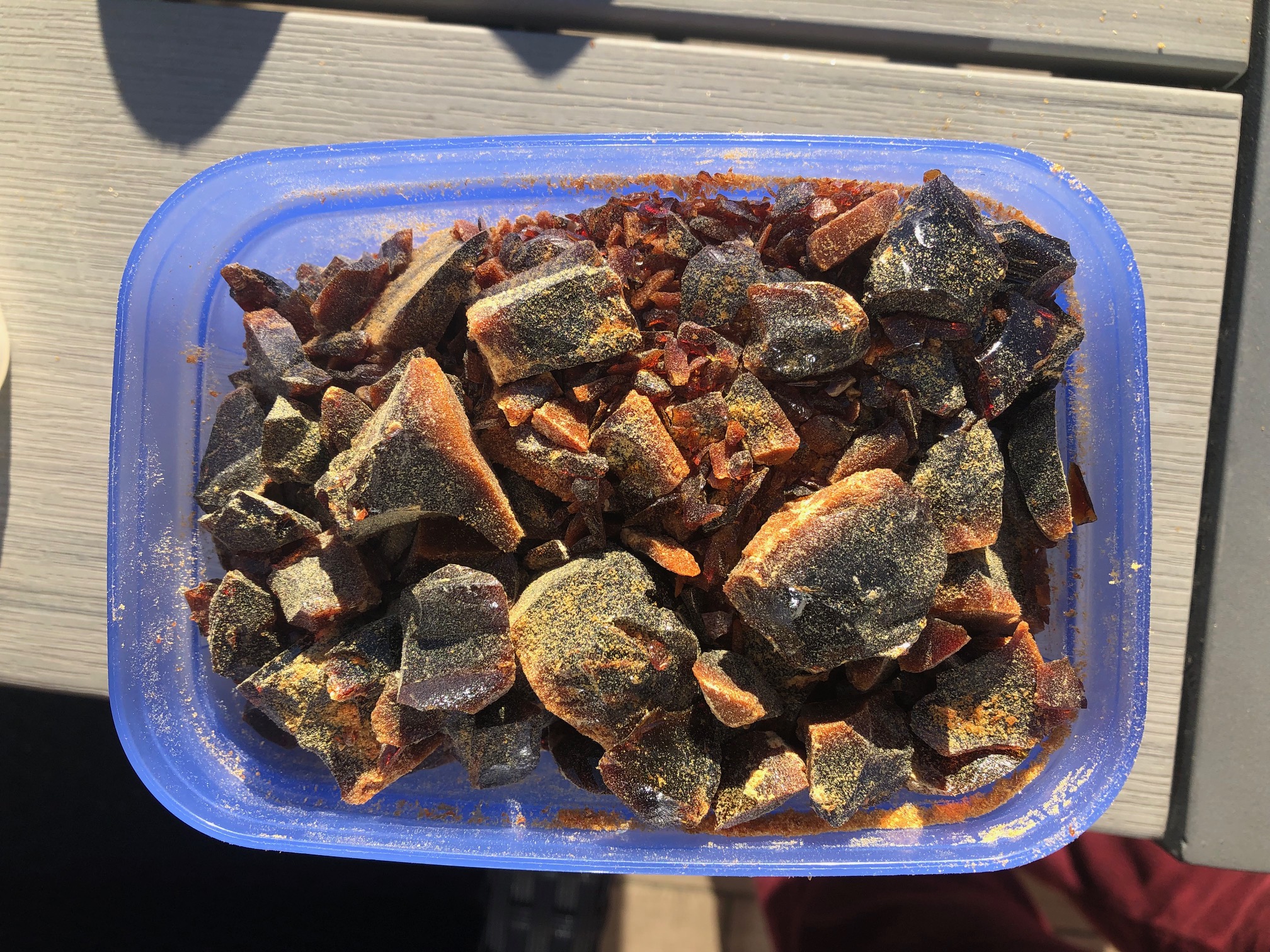 Mit dem Ergebnis bin ich sehr zufrieden: 950 g glasartig erkalteter Kandiszucker mit einem herrlichen Geschmack nach Karamell, Brotkrume und Trockenfrüchten. Die rund 50 g Verluste dürften vor allem dadurch zu erklären sein, dass beim Ausgießen doch etwas am Topfrand kleben geblieben ist. Der Geruch, auch noch einige Zeit später in der Küche, ist genial.