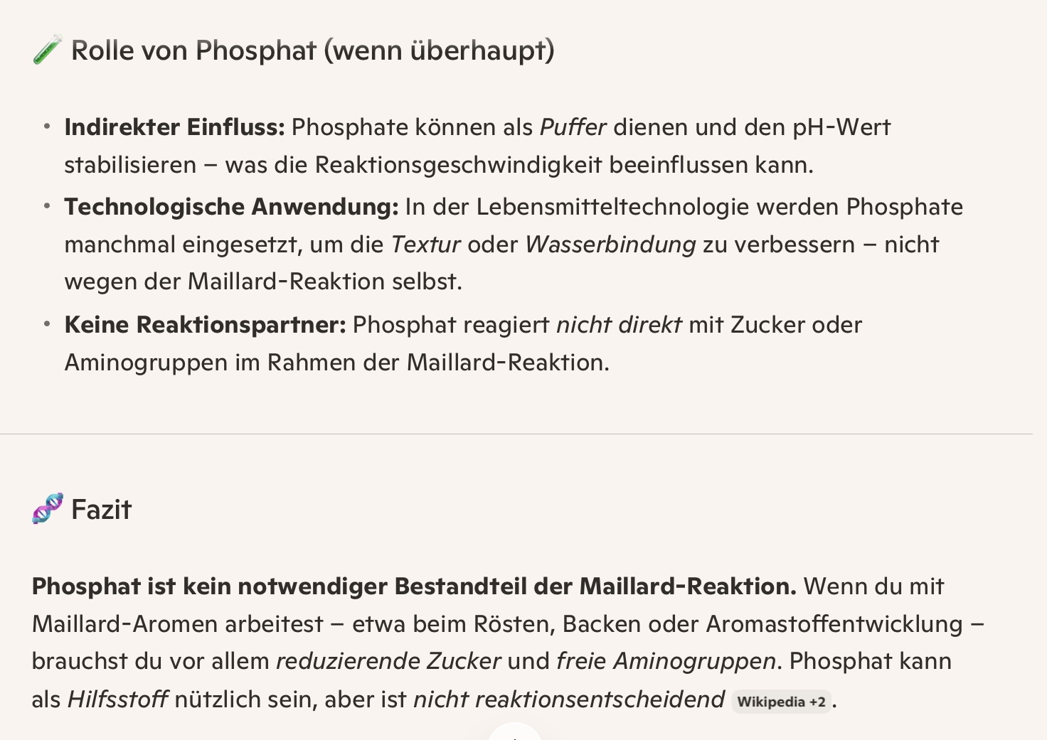 Ja, Maillard braucht kein DME, aber Aminosäuren, also z.B. aus Eiweiß; DME hat diese, Honig auch ein paar. Phosphat ist dafür nicht nötig, kann aber als Puffer eingesetzt werden und hat wohl einen Einfluss auf die Reaktionsgeschwindigkeit. Das habe ich allerdings nicht aus meinem alten Chemiewissen, sondern aus der KI. Anbei ein Screenshot der Antwort.