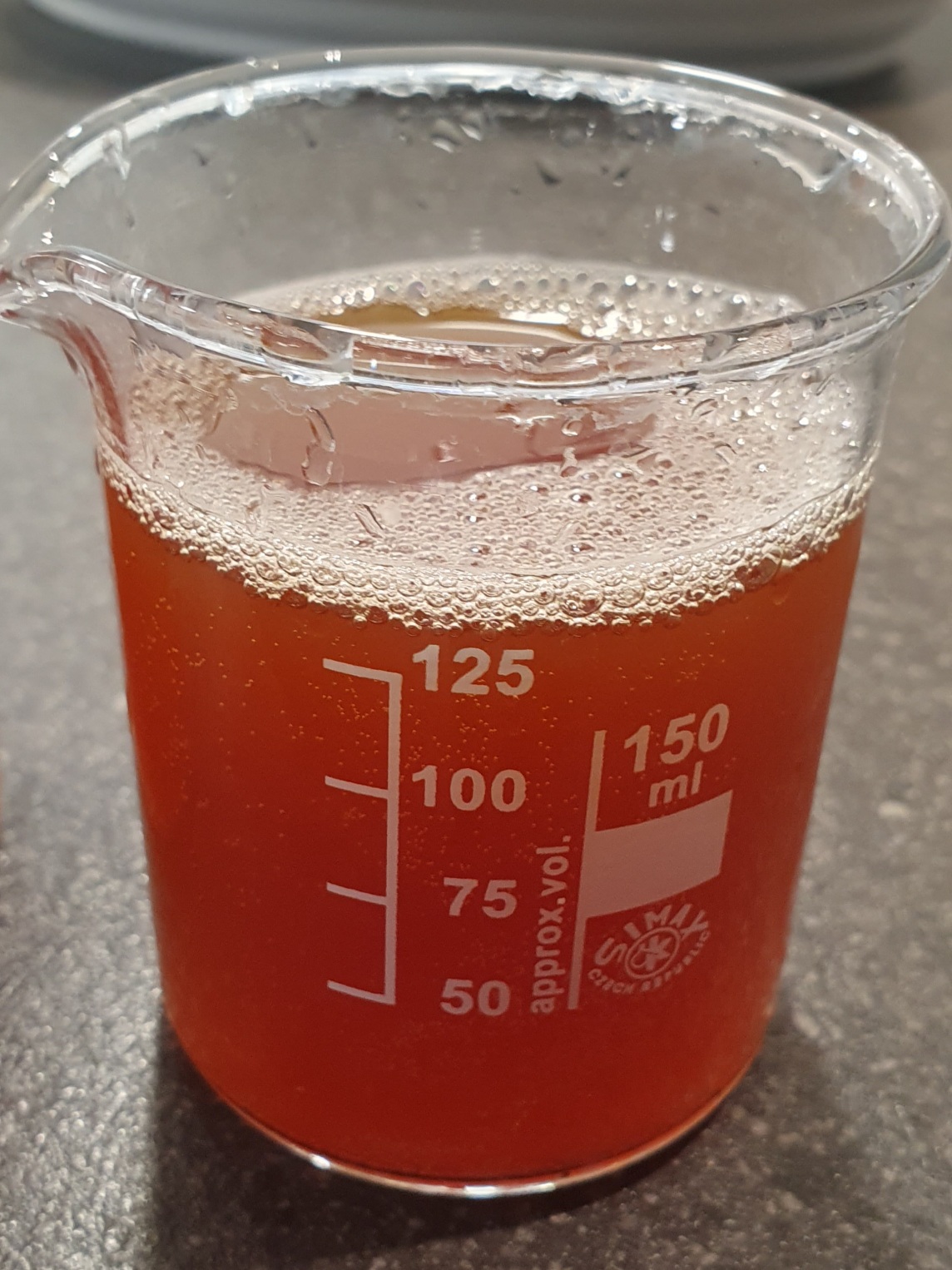 Die Farbe des Jungbiers bei Abfüllung gefällt mir schon mal sehr gut, schönes Rot! Die leichte Hefetrübung lagert sich noch aus.