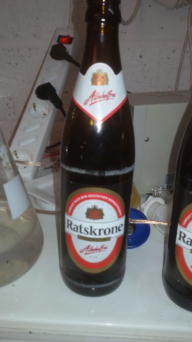 Meins kommt in Glasflaschen, vom Edeka Getränkemarkt gekauft. Heute Abend werde ich ein bisschen genauer darauf schauen. Laut Michael Zepf (Doemens-Seminar), sollte jedes Münchner-raum alkfreies Helles in Ordnung sein. Mit Ratskrone, ich habe zuerst nur eine Flasche gekauft und gekostet. Es war süß, schmeckte nach Würze und hatte ein Restextrakt von 6,5°P, ich dachte also es sollte in Ordnung sein. Und war es auch.