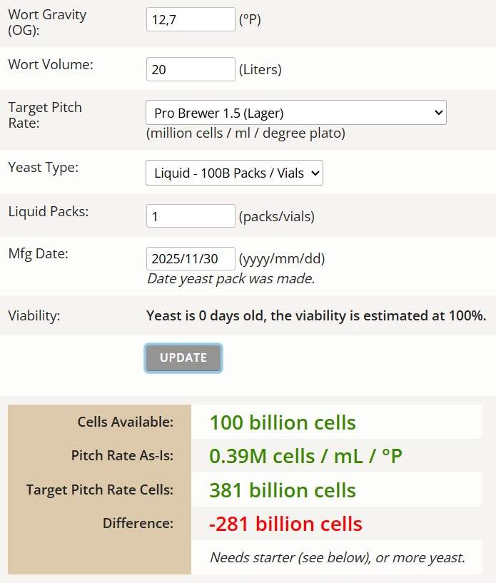 Das ist sicherer. Dafür sind diese Rechner da. Insofern stimmt es, was da steht: Du benötigst 4 Pack, wenn Du wie üblich bei 8-10 °C anstellst. Da dies teuer ist, propagiert man meist mit 1 Pack und macht einen Starter. In Deinem Fall ist das SG 1.051 und 379 Mrd. Zellen. Die stellst Du bspw. bei 10 °P mit 2 l Starter an. Das ergibt 393 Mrd. Zellen, wenn die Hefe sehr frisch ist.