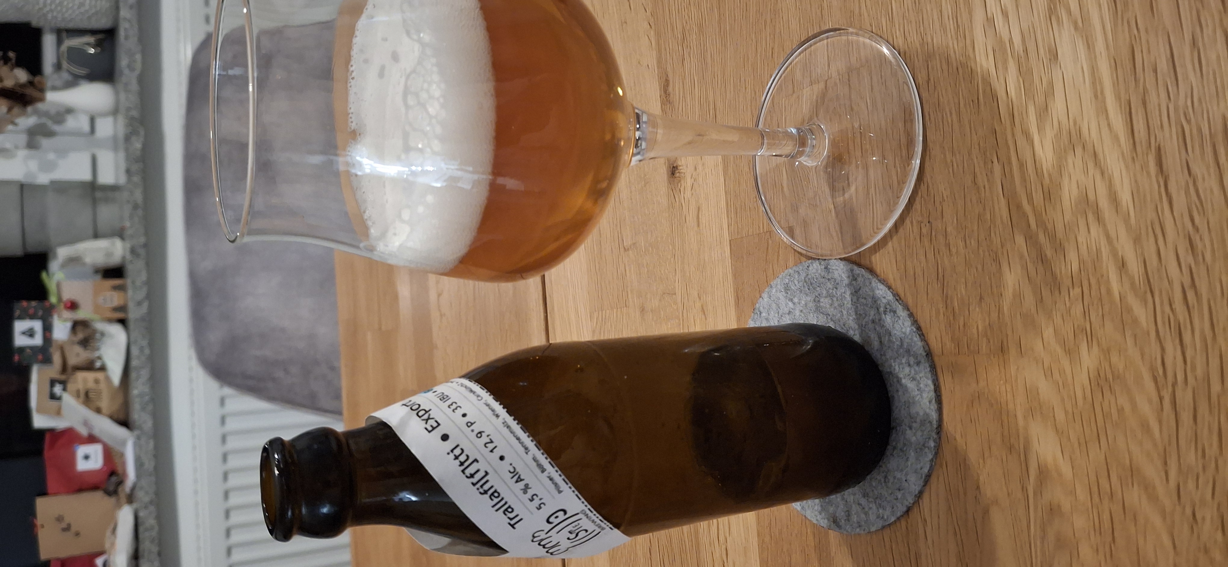 Dieselbe Basis, diesmal aber mit W34/70 vergoren und zusätzlich mit Polaris aromatisiert. Im Glas wirkt es minimal trüber und dunkler als das erste Trallafifit, dazu mit etwas weniger stabilem Schaum.