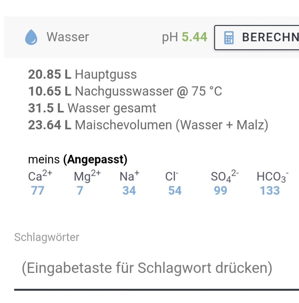 Und prüfe noch einmal Deine Einstellung mit dem Hauswasser. Wenn Kationen und Anionen bei Rechnern wie Schlupf oder Brew'n Water zu stark abweichen, ist das immer ein Indikator für eine fehlerhafte Dateneingabe und damit Berechnung. Gerade als Anfänger prüft man besser einmal mehr als zu wenig alle Werte durch. Man entdeckt dabei, dass man fast alle Werte über andere Rechenwege überprüfen kann.