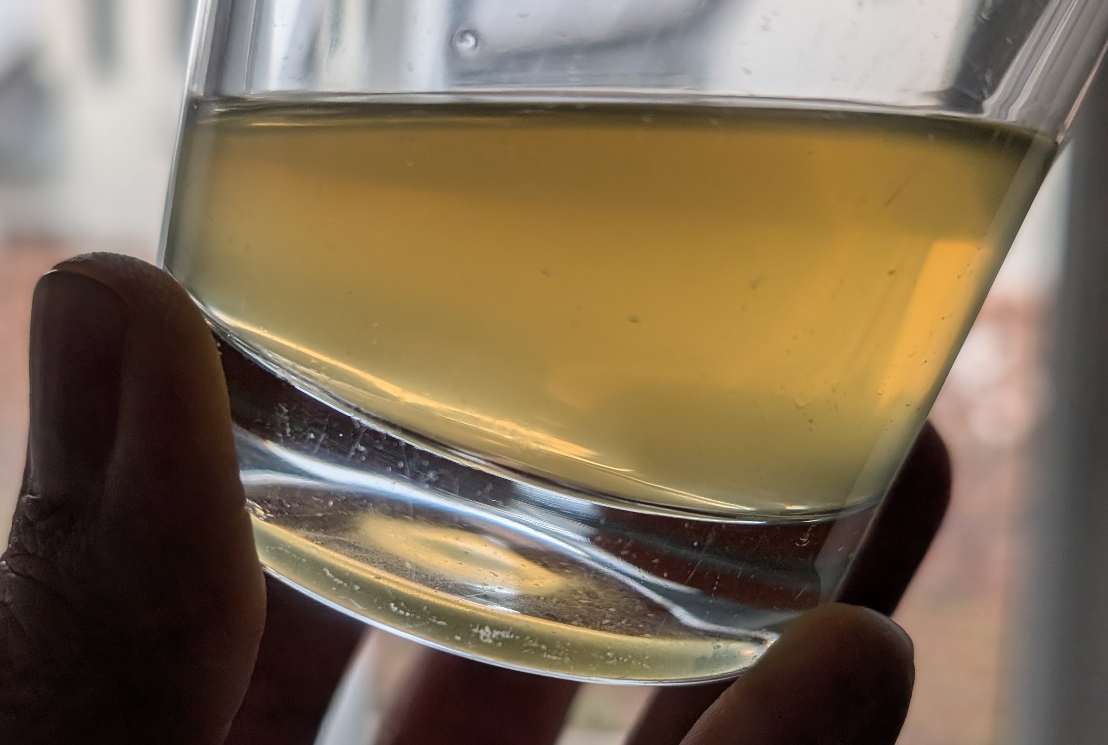 Momentan sieht es nach naturtrüben Apfelsaft aus, ist aber bei der Schüttung von 94% Pilsener & 6% Caramalz auch nicht verwunderlich. Fülle jetzt ins KEG ab und dann kommt das bei 4°C in die Kaltreifung. Ich denke das wird dann noch deutlich klarer.