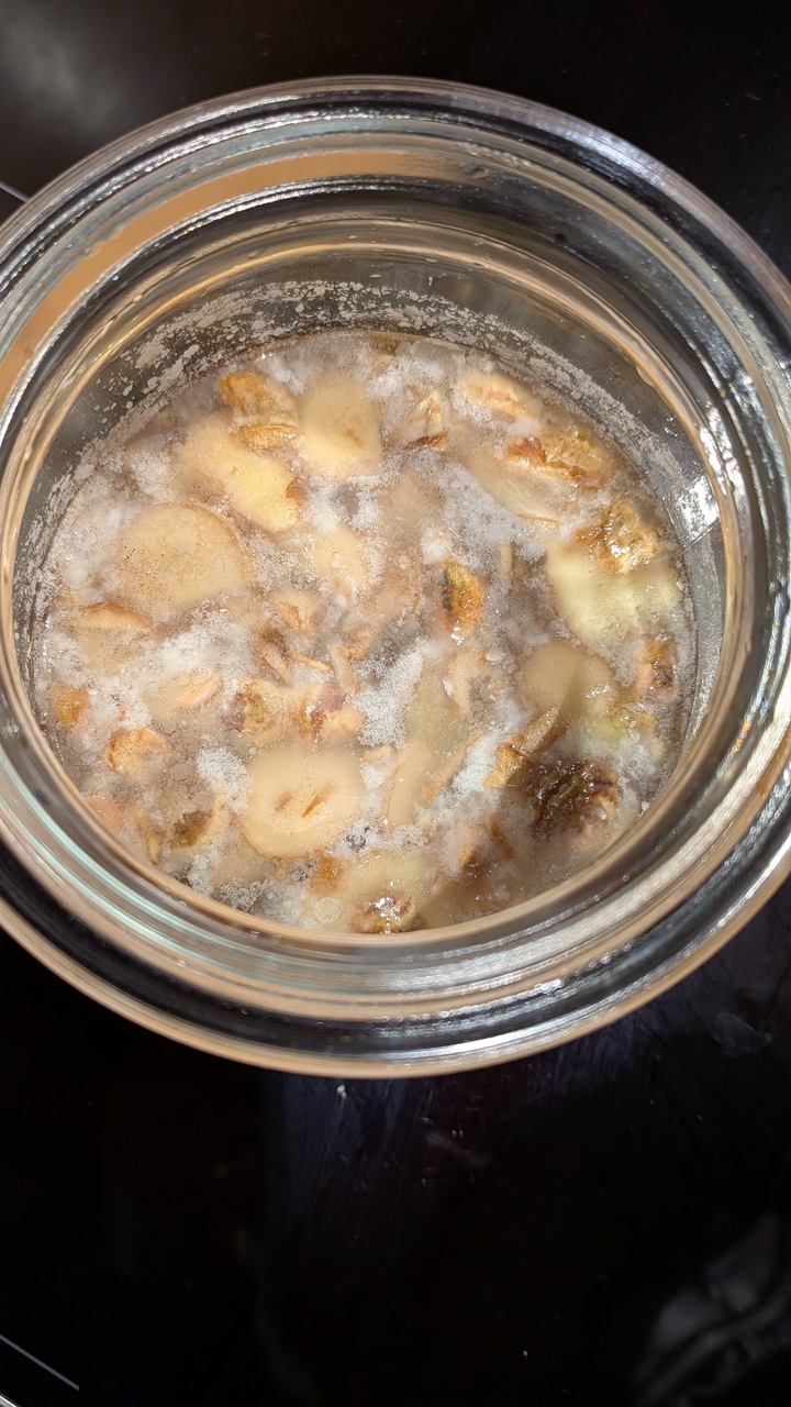 Nun zum aktuellen Sud. Habe wieder ohne den Ingwer zu waschen angesetzt. Allerdings diesmal in einem Einmachglas mit überzogenen Käsetuch. Alles natürlich gewaschen und desinfiziert (außer den Inger). Nach einer Woche sieht das Gärbild nicht sonderlich gesund aus. Es hat sich eine Kahmhaut und ein Pelz gebildet. Ich denke da haben sich Schimmelsporen eingenistet. Also ab auf den Kompost damit. Der profitiert wahrscheinlich davon. Der nächste Versuch wird wieder im Bierbrau-Stil mit Gärspund gemacht.