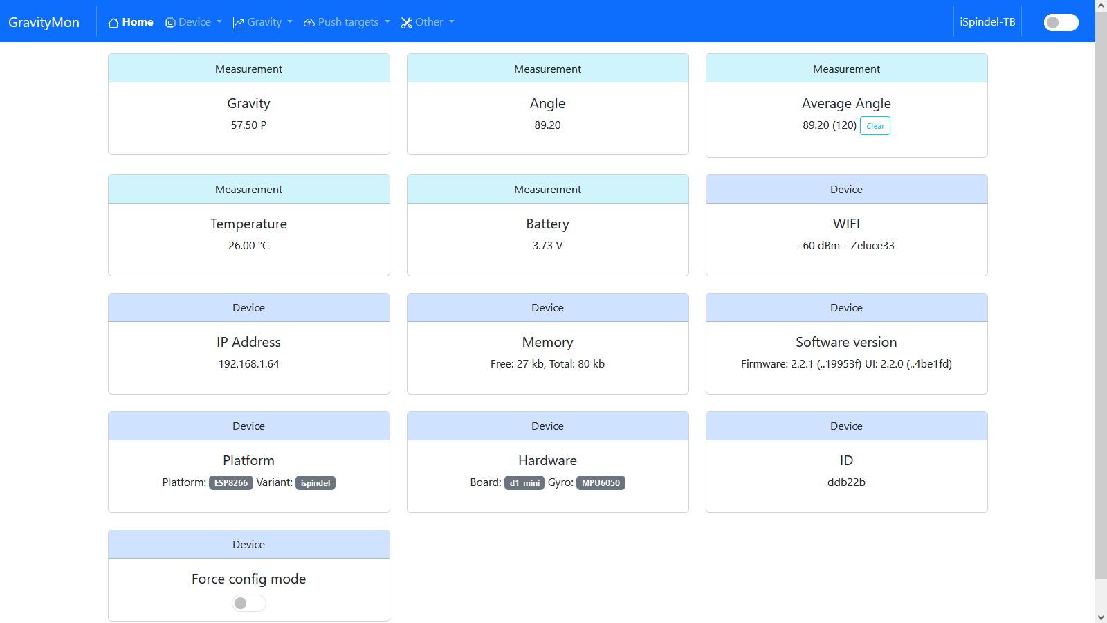 GravityMon ist eine Ersatz-Firmware für die iSpindel und verwendet die gleiche Hardware-Konfiguration und ist 100% kompatibel. Es implementiert eine Menge der Funktionen, die im ursprünglichen iSpindel Projekt angefordert, aber aus verschiedenen Gründen nie umgesetzt wurden.