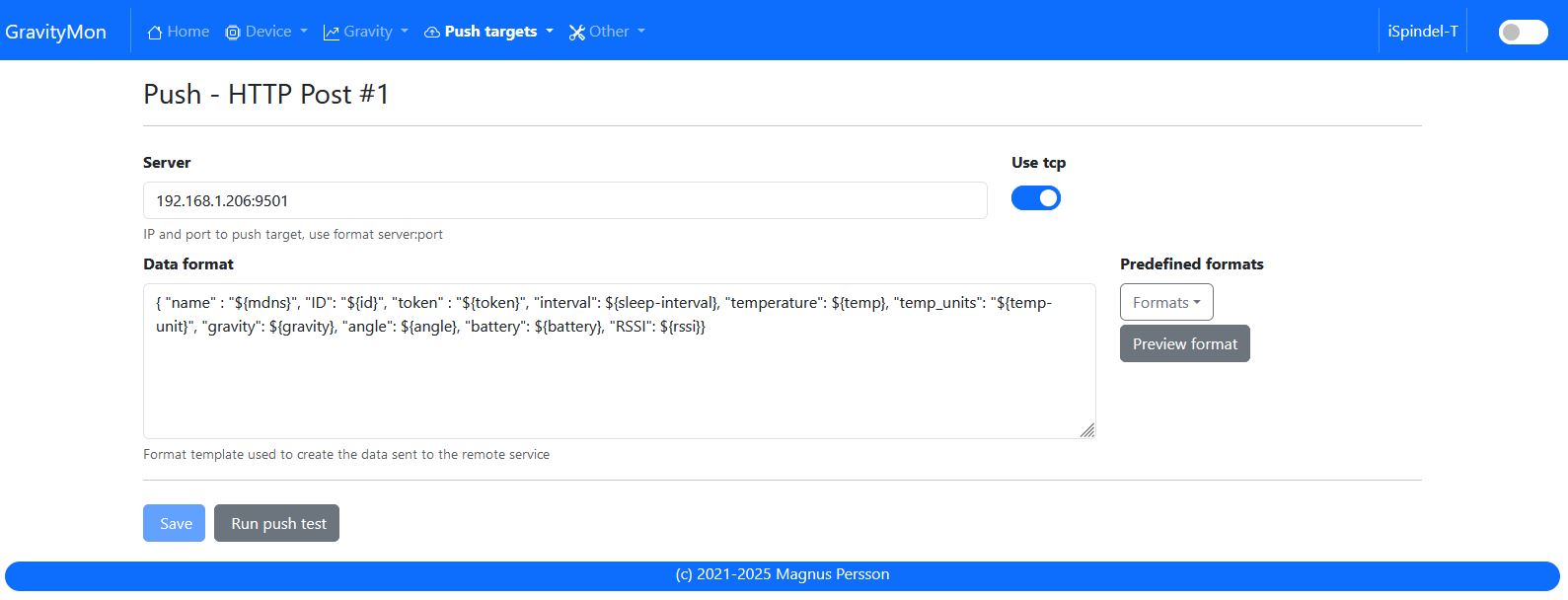 Versuche einmal die Einstellung "Use tcp" im "Push - HTTP Post #1", mit welcher ich die Daten per TCP zum „RasPySpindel Server“ übertrage: