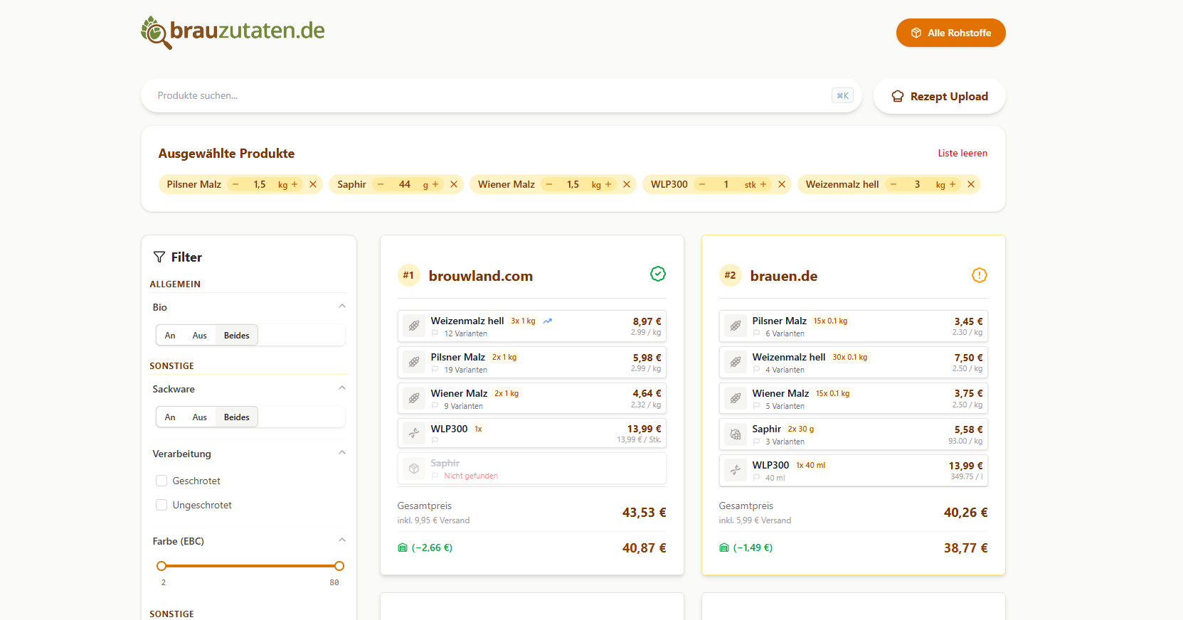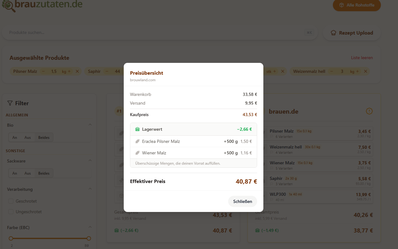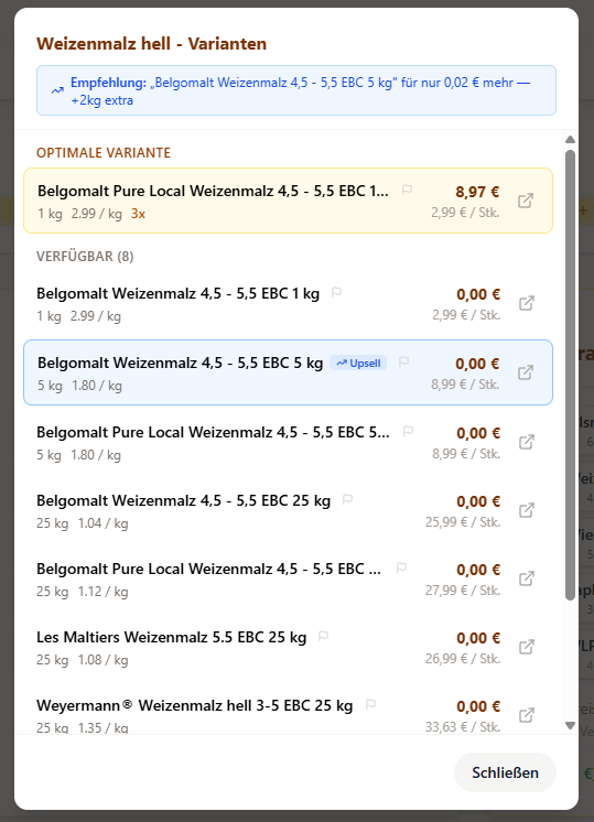 - Upsell-Vorschläge: „Für 0,90 € mehr bekommst du 2kg Malz mehr“ – das Tool achtet auf Preis-Leistungs-Kniffe.
