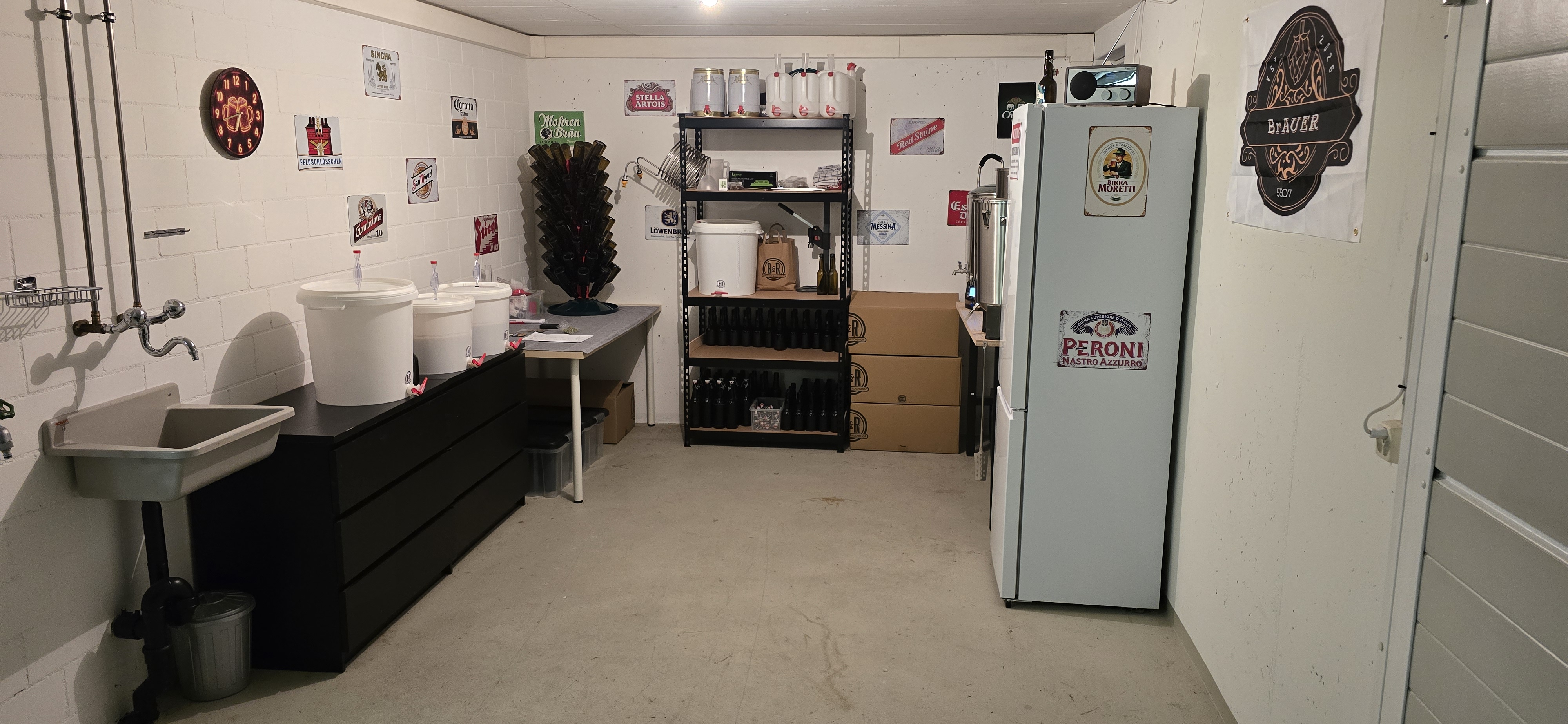 Gerade kocht ein Münchner Helles und in der Gärung habe ich ein Mango-Weizen, ein Erdbeer-Weizen und ein Wit-Bier.