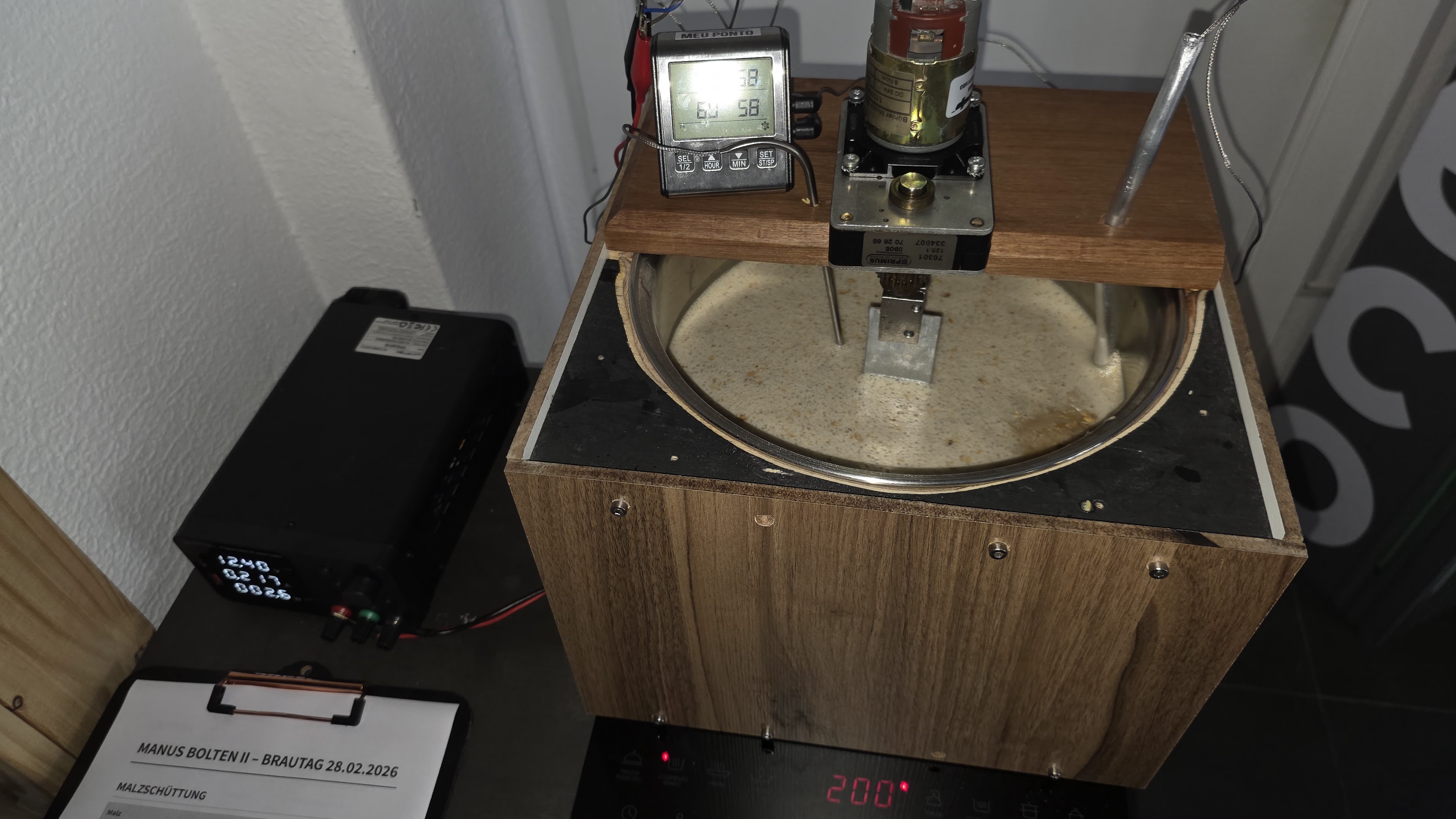 Bis zur Laeuterruhe dreht die ganze Zeit das Ruehrwerk. Mal schneller, mal langsamer, darueber kann ich die Temperatur sehr gut steuern.
