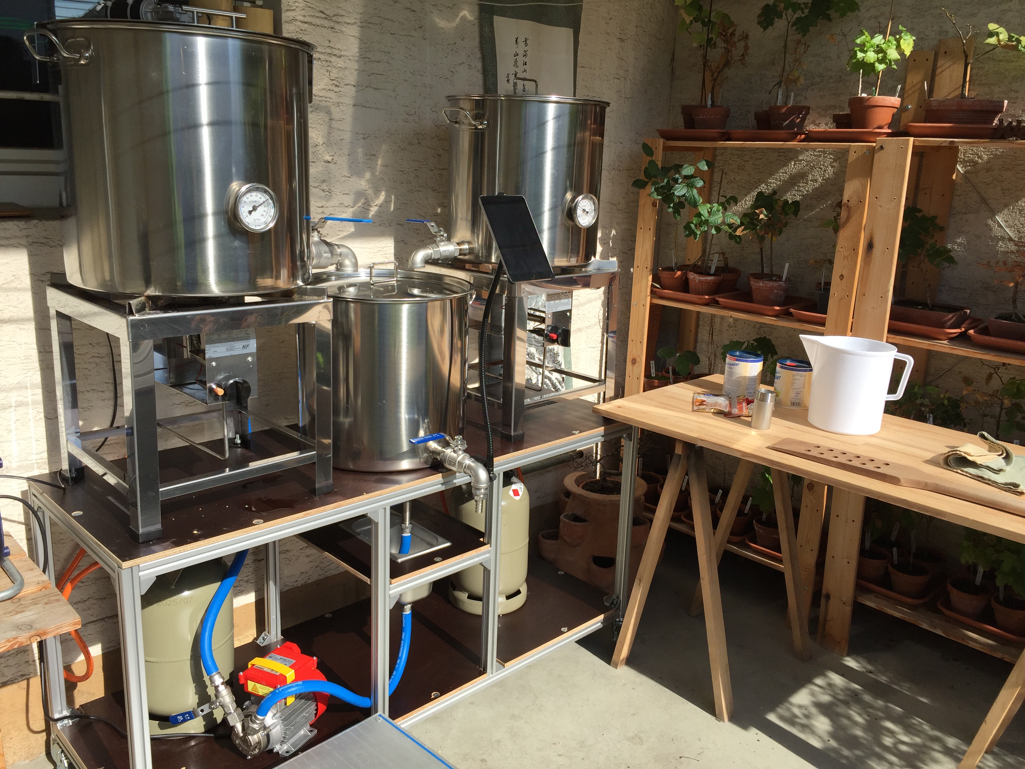 So eine Anordnung hatte ich bei meiner Anlage auch mal, bevor ich das Gestell hatte, nur war dann die Würzepfanne so hoch, dass ich nicht mehr reinschauen konnte.