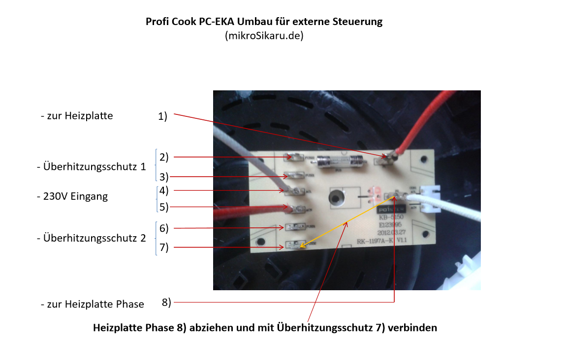 Ich möchte das ein wenig anders aufziehen. Die Ansteuerelektronik und die Temperatursensoren des Profi Cook Gerätes bleibt erhalten. Am Ende habe ich weiterhin nur den Profi Cook der ans Netz angeschlossen wird, nur eben mit teilweise neuem Innenleben.