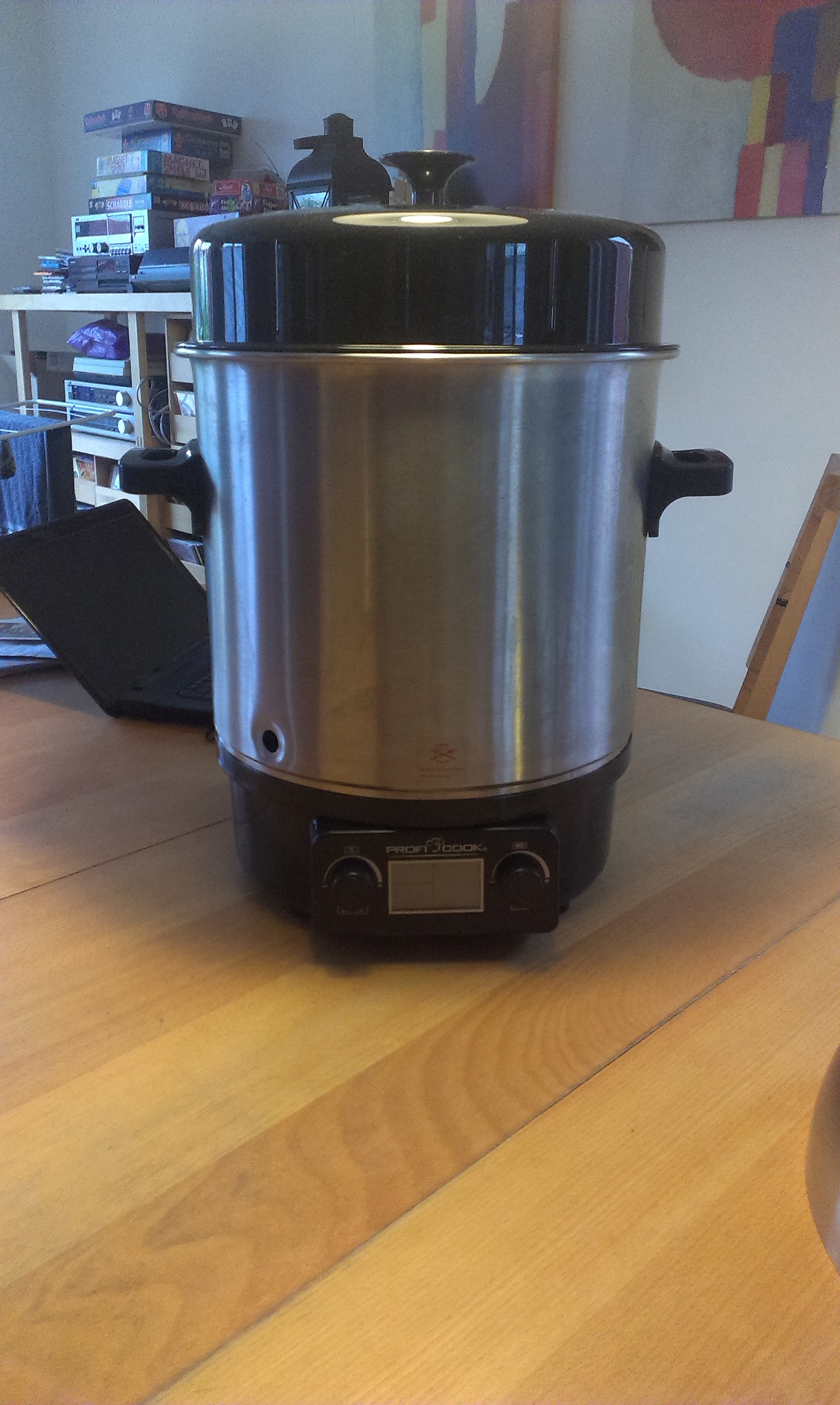 Deckel geht beim Kochen nicht weil es übergeht. Die Brüdenhaube hilft da auch nicht so ganz, aber man kann einen Schlauch nach draussen drauf setzen, oder einen Dampfkondensator (Bild) anschließen. Ziel ist es 10% der Würze zu verdampfen ohne Sauna im Raum. Das schmeckt man dann. 5l Wasser die an den Wänden runter rinnen sind doch etwas viel, wenn man in kleinen Räumen arbeitet.