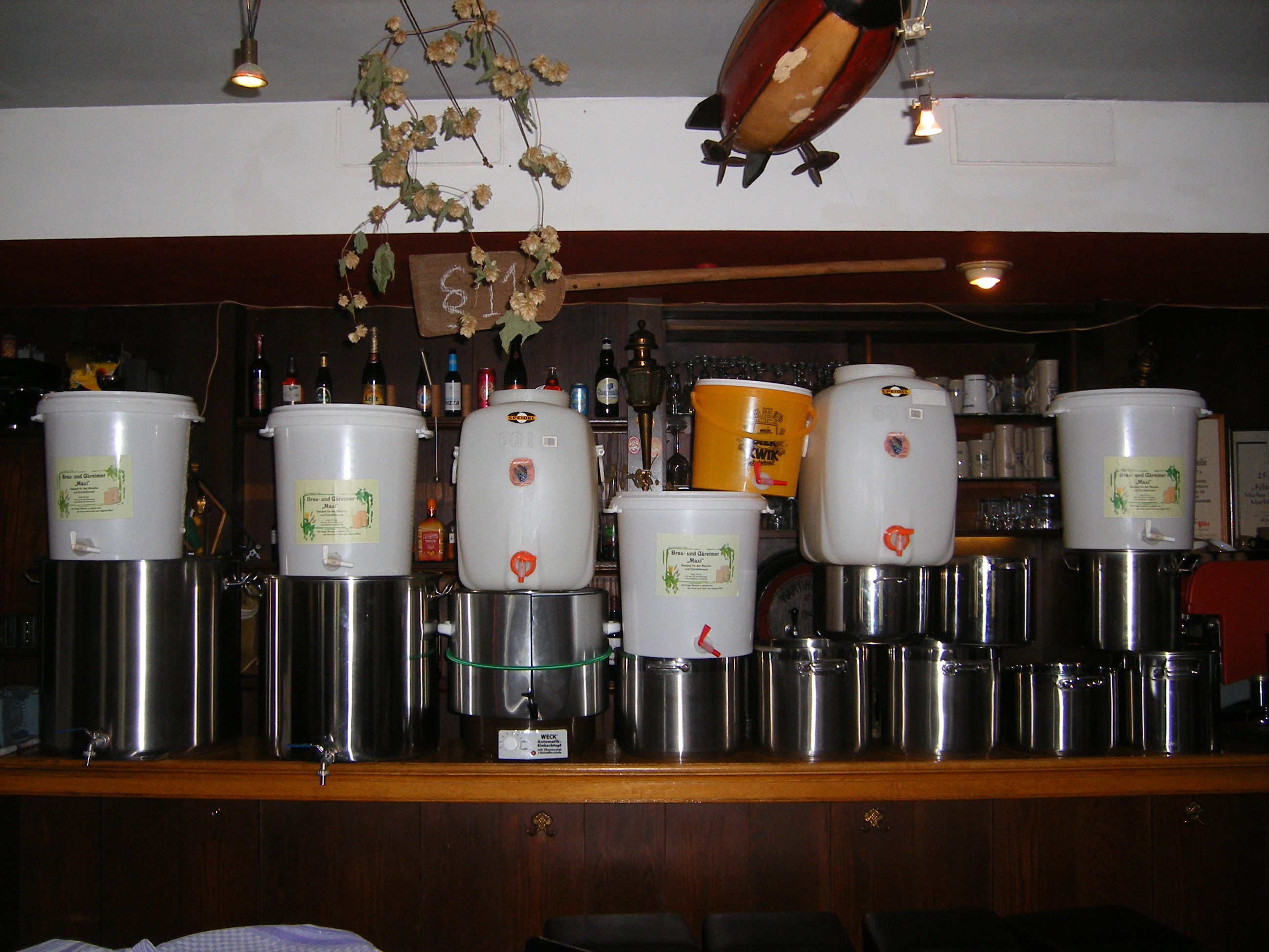 Von links nach rechts. Ein 94l Topf von amihopfen, ein 70l von Bergland, zum maischen und kochen. Danach die Töpfe für das Nachgusswasser.