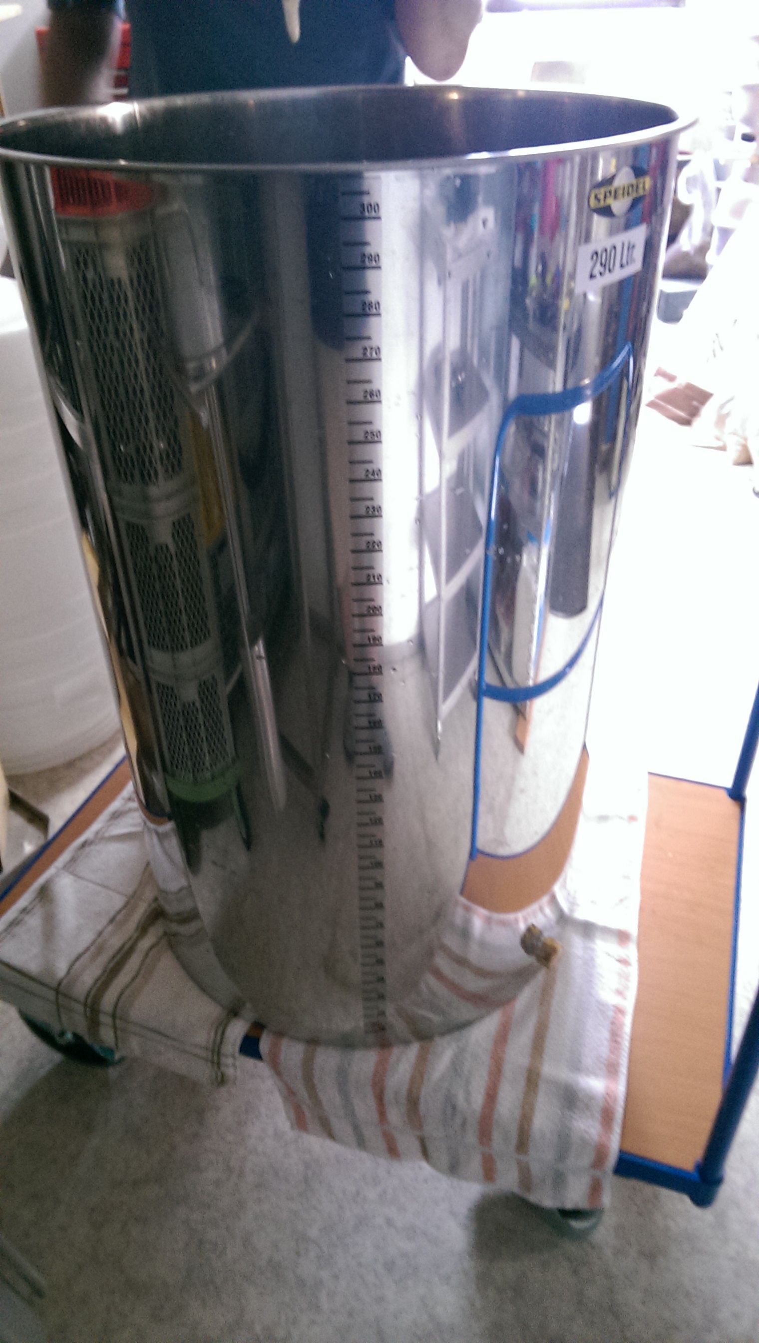 Man sieht, wie das Kondenswasser immer noch in Strömen hinunterläuft. Die Gärung verlief bei 7,2 bis 8,1 Grad am Schluss und dauerte exakt bis gestern. Heute war der erste Tag, an dem sich die Spindel nicht mehr bewegte. Wir hatten einen Restextrakt von knappe 4% gemessen.