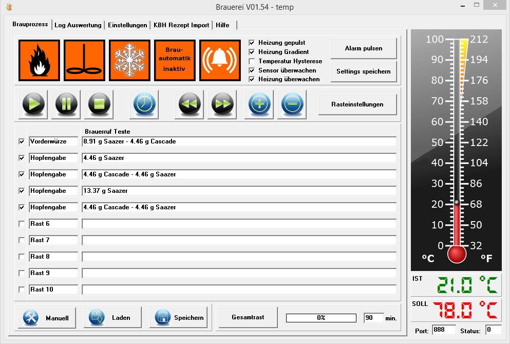 Das Programm kannst du auch komplett ohne Hardware testen. Musst nur unter manuell auf Simulation stellen. Dann kannst du alle Funktionen ausprobieren. In meinem Fall sah das Rezept so aus...