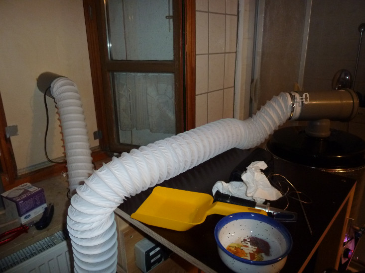 Über den Flexschlauch geht's ins freie mit dem Dampf. Wo das Kabel rauskommt sitzt ein Rohrlüfter.