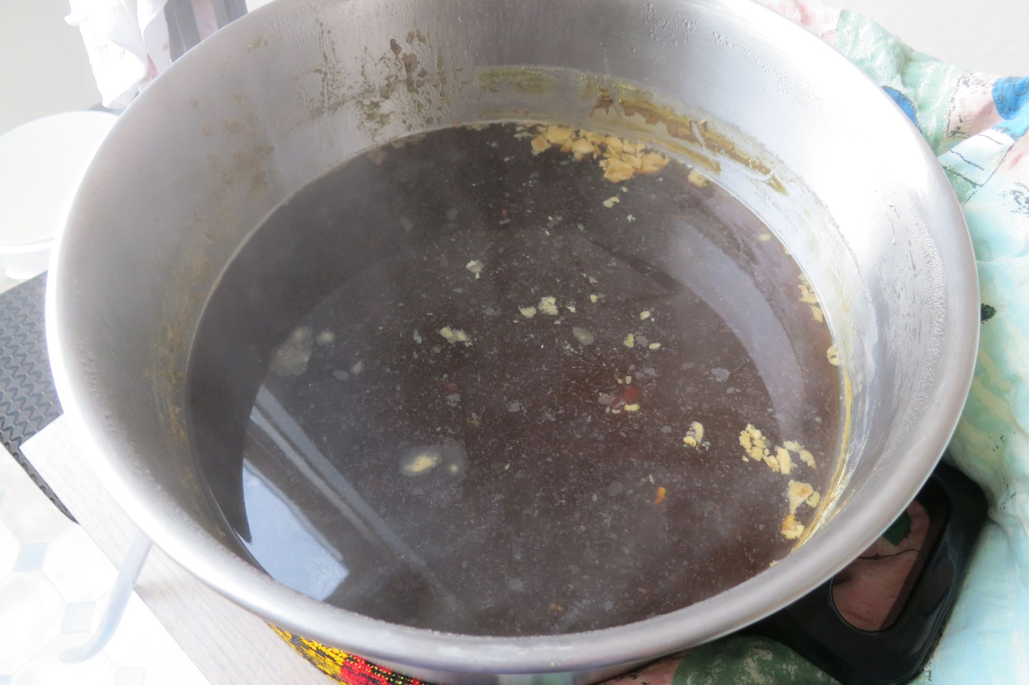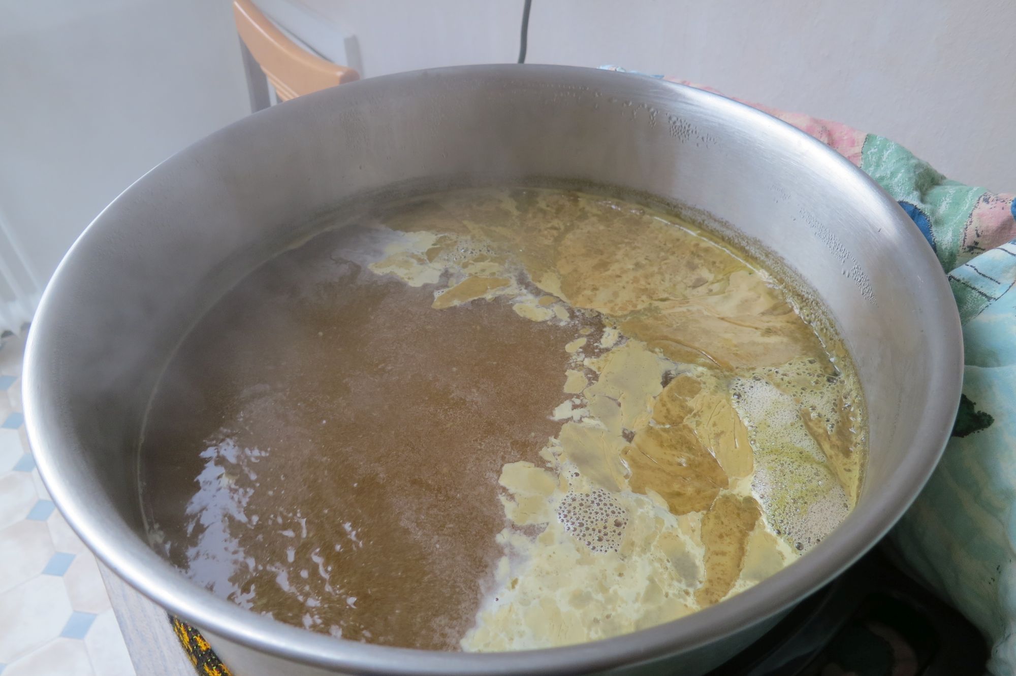 Nach 90 Minuten Kochen, der Pegel ist etwas gesunken. Ich brauchte aber nur mit 1 Liter Wasser auffüllen. Dies habe ich mit Eis getan um schneller abzukühlen. Danach gings noch ne Stunde in die Badewanne zum abkühlen!
