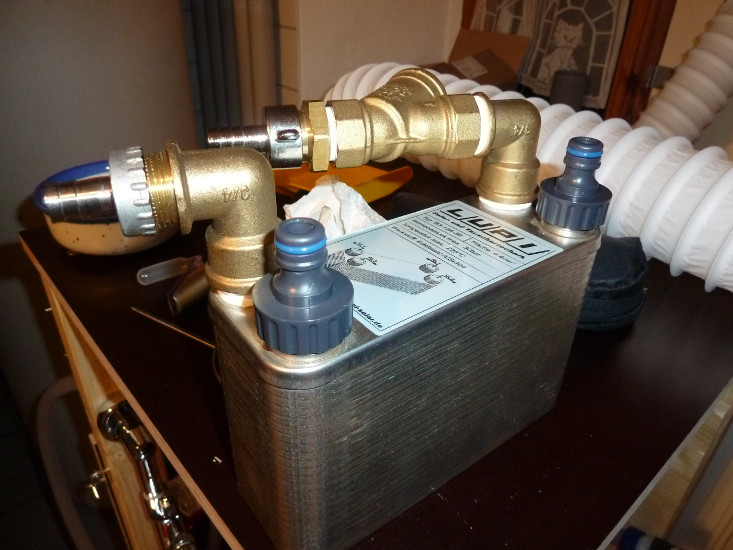 Zum Kühlen verwende ich einen Plattenwärmetauscher mit vorgeschaltetem Schmutzfänger. Nach Gebrauch wird der mit Wasser durch- und rückgespült und mit hochprozentigem Alkohol gefüllt gelagert.