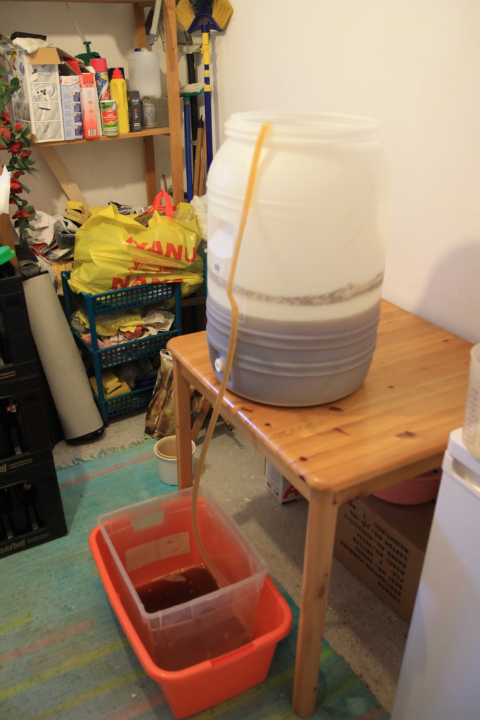 Also weiter mit läutern. Ich mach das immer noch klassisch wie ich's gelernt habe mit der Hand. Also abschöpfen und in einen am Boden gelochten Läuterbottich.