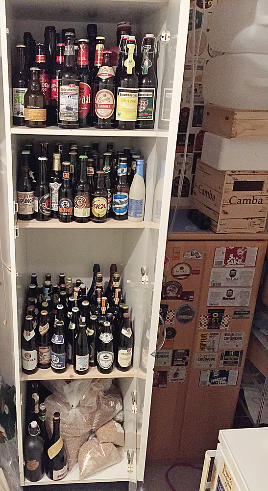 Zu sehen: Alle, die man mal so hier und da erworben hat oder geschenkt bekam. Die Selbstbräus stehen im rechten Schränkchen ...