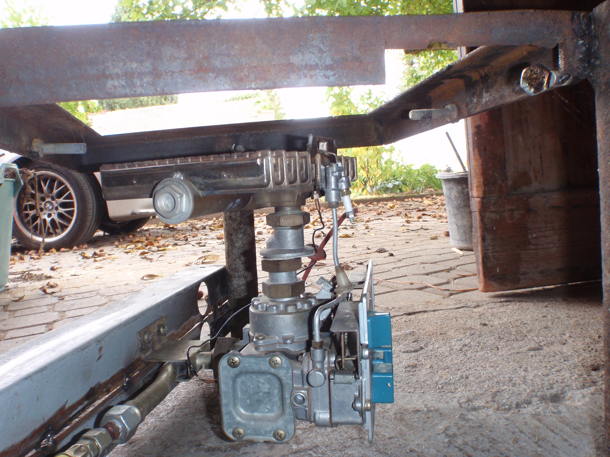 einfach Unterteil , also die Gasfeuerung herausgeschraubt und einen Druckminderer mit Schlauch für Flasche dran und das Ganze unter ein Gestell für den Topf geschraubt. Siehe Bilder. Für den nächsten Gebrauch kommt noch ein Blech zwischen Brenner und Regelung so wie es in der Therme auch ist, nur grösser.Du kannst den Regler wegen der großen Hitze fast nicht bedienen!