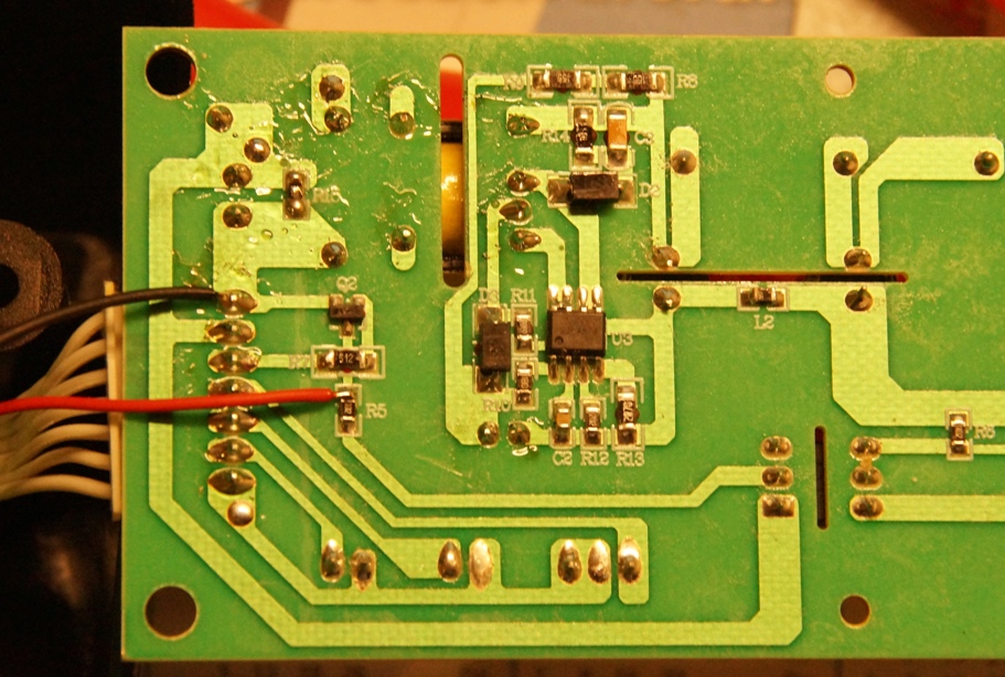 - Vor dem Aufschrauben auf jeden Fall den Netzstecker ziehen. Auf der selben Platine befindet sich das Netzteil (primärgetacktetes Schaltnetzteil und damit 400V Gleichspannung auf der Platine!