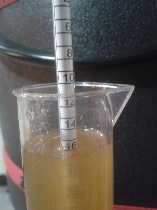 Laut Anleitung/Rezept sollten wir zwischen 12 und 14°P landen. Auf die Idee, von den 16 runterzuverdünnen kam natürlich keiner...
