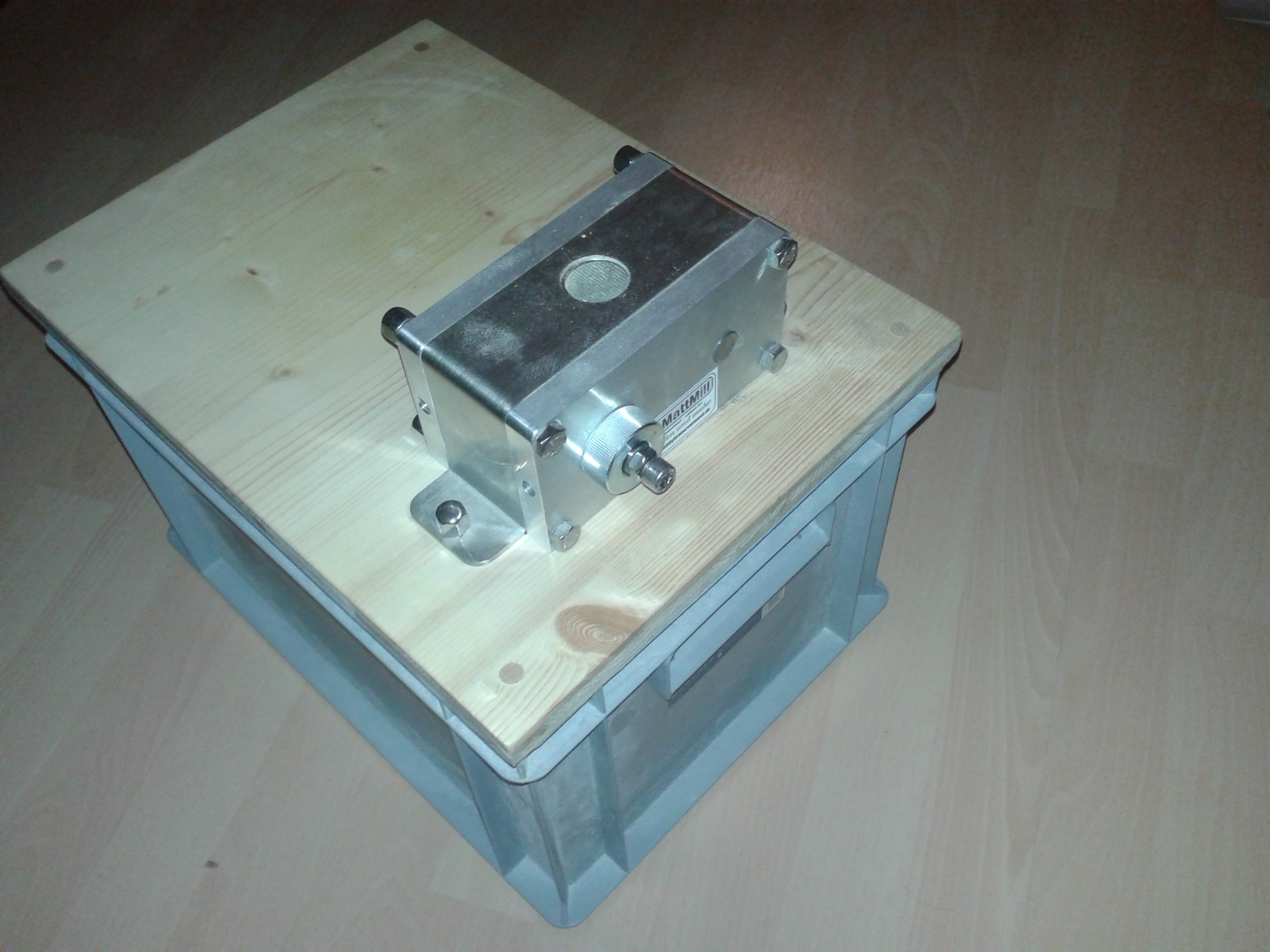 Ich hab meine Mühle auf einem Brett mit Nut. Das sitzt so stabil auf dem alten Einkochtopf. Angetrieben wird bei mir mit einer Bohrmaschiene auf niedriger Geschwindigkeit.
